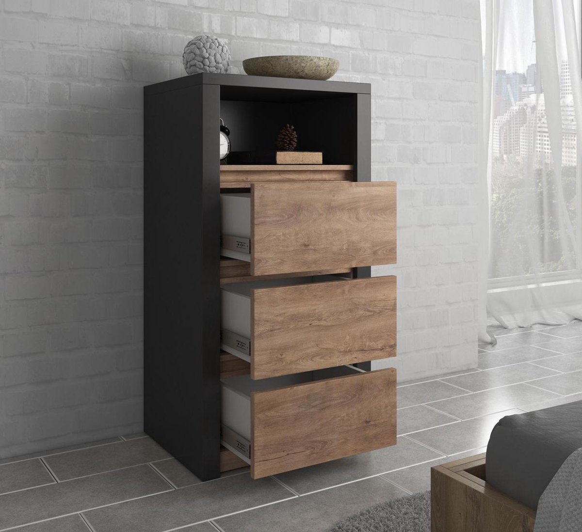 Met zijn industriële uitstraling is de Commode Monaco een echte eyecatcher in huis. De ladekast beschikt over 3 greeploze lades en een handig open vak, waardoor je zowel kleine als grote items gemakkelijk kunt opbergen. De Monaco is ontworpen met oog voor detail en kwaliteit, waardoor het meubel een duurzame en solide keuze is. Bestel de Meubella Ladekast Monaco in de kleur Eiken-Grijs vanuit het comfort van je eigen huis en geniet van een snelle levering. Voor 23:00 besteld, morgen al in huis!