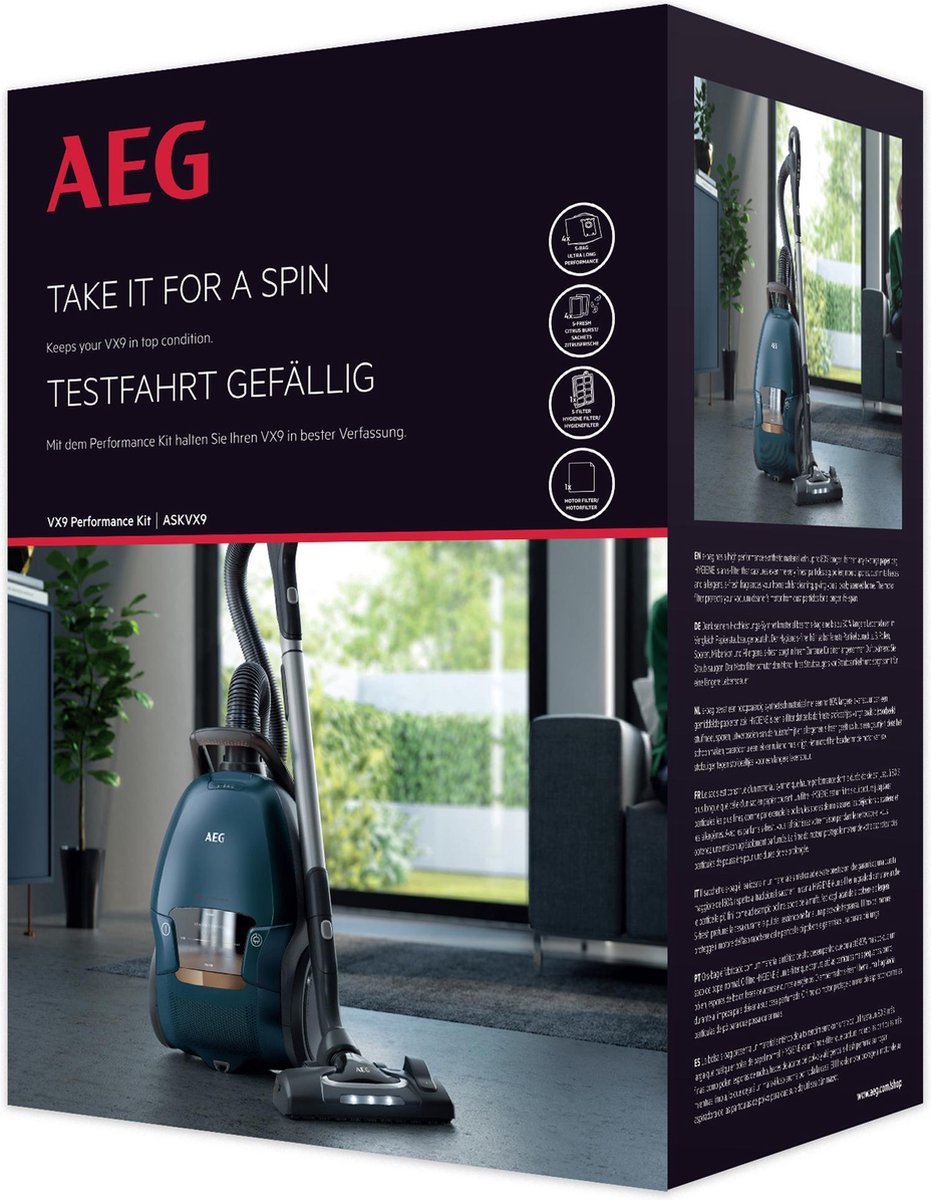 Stofzak AEG perform.kit ASKVX9 / 4De ASKVX9 performance kit voor AEG VX9 stofzuigers bevat alles wat je nodig hebt voor een heel jaar onderhoud! De set bevat 4 stofzuigerzakken, 1 hygiënefilter, 4 zakjes s-fresh geurkorrels en 1 motorfilter.
