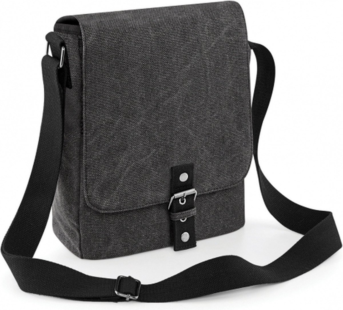 Vintage canvas schoudertas in het antraciet. Deze schoudertas met verstelbare schouderriem bevat een speciaal vak om uw IPad of tablet veilig mee te kunnen nemen. De schoudertas is gemaakt van gewassen canvas en heeft een formaat van ongeveer 23 x 28 x 7 cm. Inhoud is ongeveer 5 liter. 352 grams.