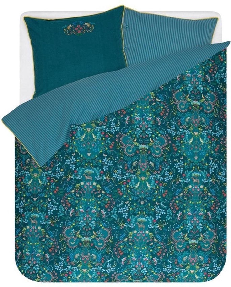 Dekbedovertrek Forrest Findings is opgebouwd uit een verfijnde symmetrische bloemenprint met kleurrijke bloemen, bladeren, elegante dieren en takjes in decoratieve vormen. De ondergrond heeft een subtiel tonaal stippenpatroon. De donkergroene achterzijde van dit dessin heeft een gestileerd tegelprintje met verfijnde details. De kussens hebben een oxford-rand, een blauwe bies en gestoffeerde knoopjes als sluiting. Hierdoor kun je beide kanten gebruiken. Dit geeft een leuk mix and match effect op je bed.