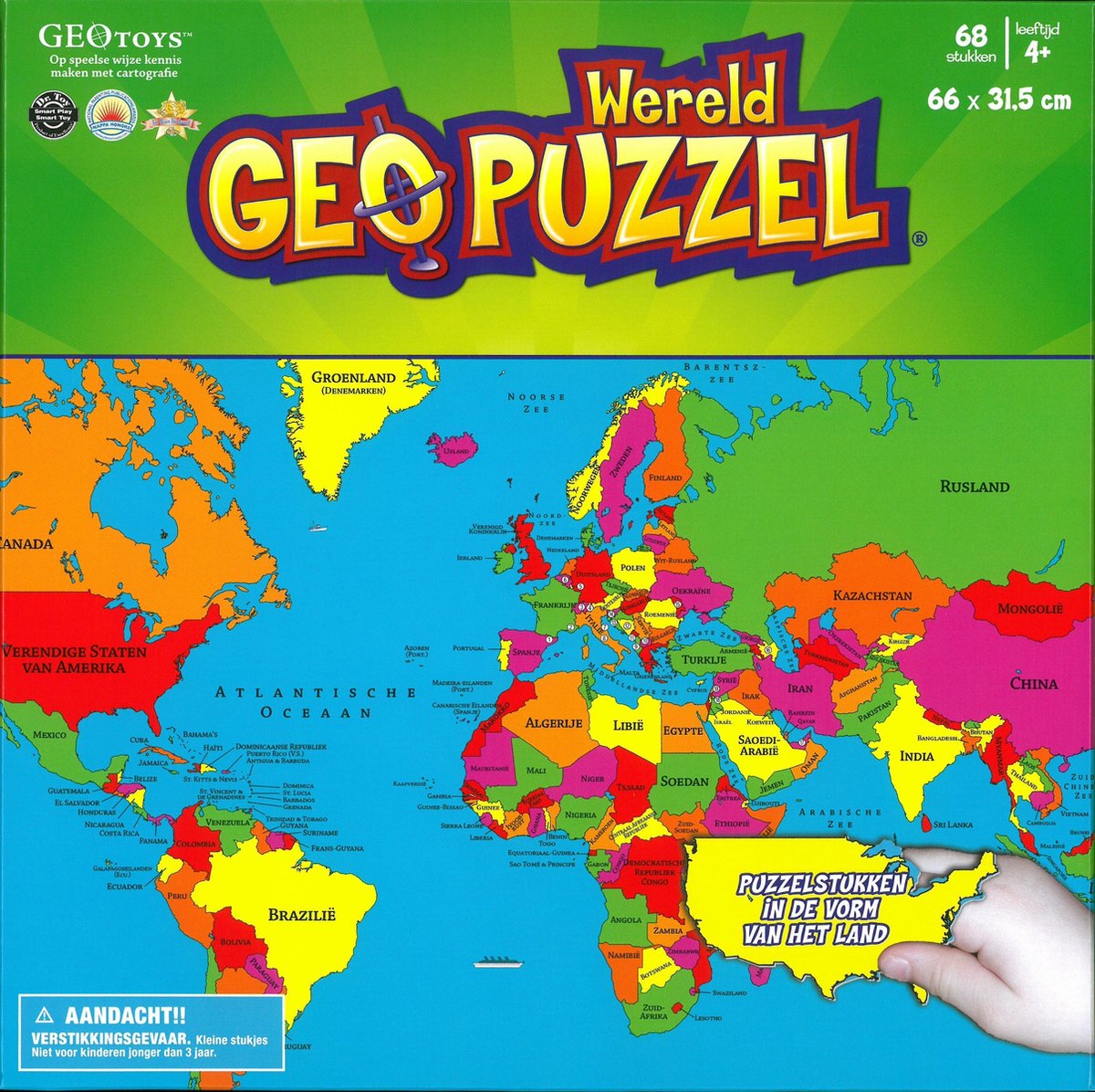 Met de GeoPuzzel World van GEOtoys leren kinderen de wereld kennen op een speelse manier. De puzzelstukken zijn in de vorm van de landen en groepen landen zodat kinderen spelenderwijs aardrijkskunde leren. De buitenkant van de puzzel vormt het frame, die de rest van de landen puzzelstukjes op zijn plaats houdt. Puzzelen is leuk om samen of alleen te doen en bovendien stimuleert puzzelen de fijne motoriek verder te ontwikkelen.... lees meer over dit product