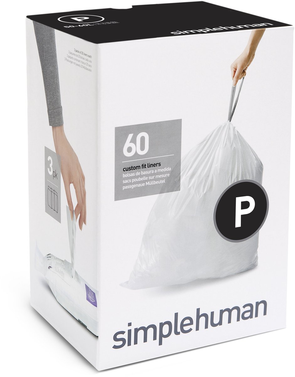 Deze code P afvalzakken van Simplehuman hebben een inhoud van 50-60 liter en zijn gemakkelijk te sluiten met een trekkoord. Doordat de zakken zijn voorzien van dubbele naden, zijn ze extra stevig. Deze zakken zijn ontworpen om perfect in de afvalemmers van Simplehuman te passen, zodat ze niet wegglijden en volledig verborgen blijven wanneer het deksel gesloten is. In één verpakking zitten 3 pakken van 20 stuks. * Simplehuman Afvalzak Code P * Wit * 50-60 liter * Kunststof De producten en ontwerpen van Simplehuman hebben talloze prijzen gewonnen. Door het oplossen van simpele problemen die vaak over het hoofd worden gezien, maakt Simplehuman mensen efficiënter bij het dagelijks werk thuis. De producten worden zeer streng getest om te garanderen dat deze bij jarenlang intensief gebruik goed blijven functioneren. Het resultaat is altijd eenvoudig, modern, functioneel en van goede kwaliteit. En ze maken alleen producten die ze zelf ook graag gebruiken. Het merk is apetrots op wat ze doen. De medewerkers genieten van het moment waarop consumenten zeggen: “Wat is dat handig!” als ze een van de producten voor het eerst gebruiken.