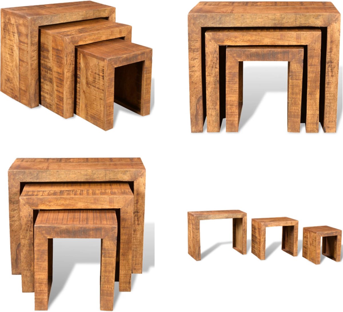 Deze tafelset is gemaakt van hoogwaardig massief mangohout, wat zorgt voor stabiliteit en duurzaamheid. Elk tafeltje heeft een unieke houtnerfstructuur, waardoor geen enkel exemplaar hetzelfde is. Van het polijsten tot het zagen en lakken, iedere stap in het proces wordt met zorg uitgevoerd om te zorgen voor een prachtig eindresultaat.
