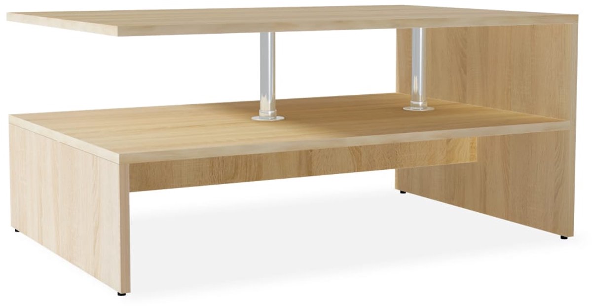 De salontafel is gemaakt van spaanplaat met PVC randen, waardoor hij niet alleen stabiel en duurzaam is, maar ook een moderne uitstraling heeft. De roestvrijstalen steunen dragen bij aan de stevigheid en het design van de tafel.