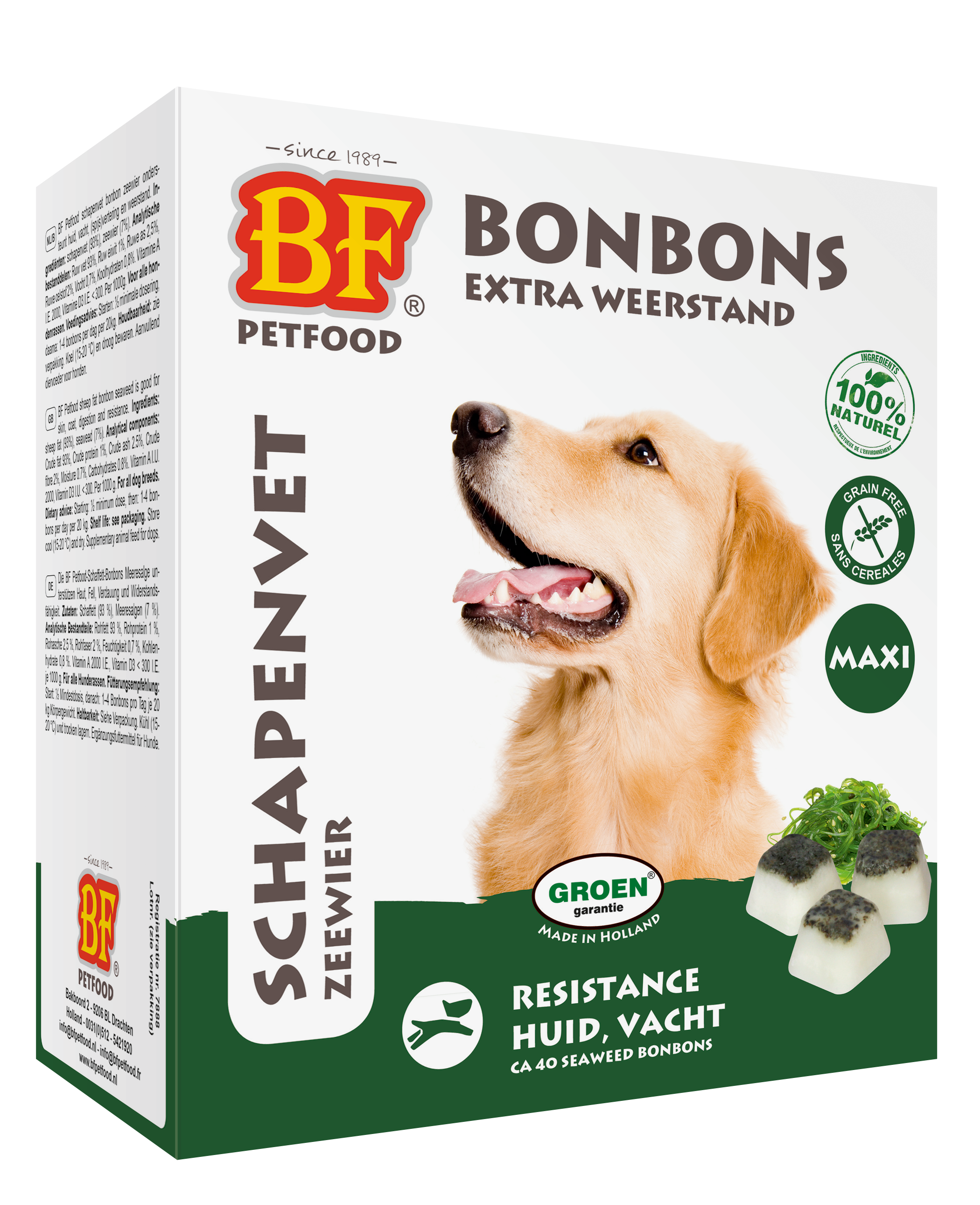 Ontdek de probate werking van BIOFOOD Schapenvet Bonbons met zeewier. Deze bonbons zijn niet alleen een smakelijke traktatie voor je hond, maar ook een uitzonderlijk gezonde toevoeging op zijn dagelijkse voeding. Het dunne laagje zeewier op de bonbon zorgt voor extra weerstand tegen ziekten en virussen, terwijl het schapenvet zelf een gunstige werking heeft bij huid- en vachtproblemen en maag- of darmproblemen.