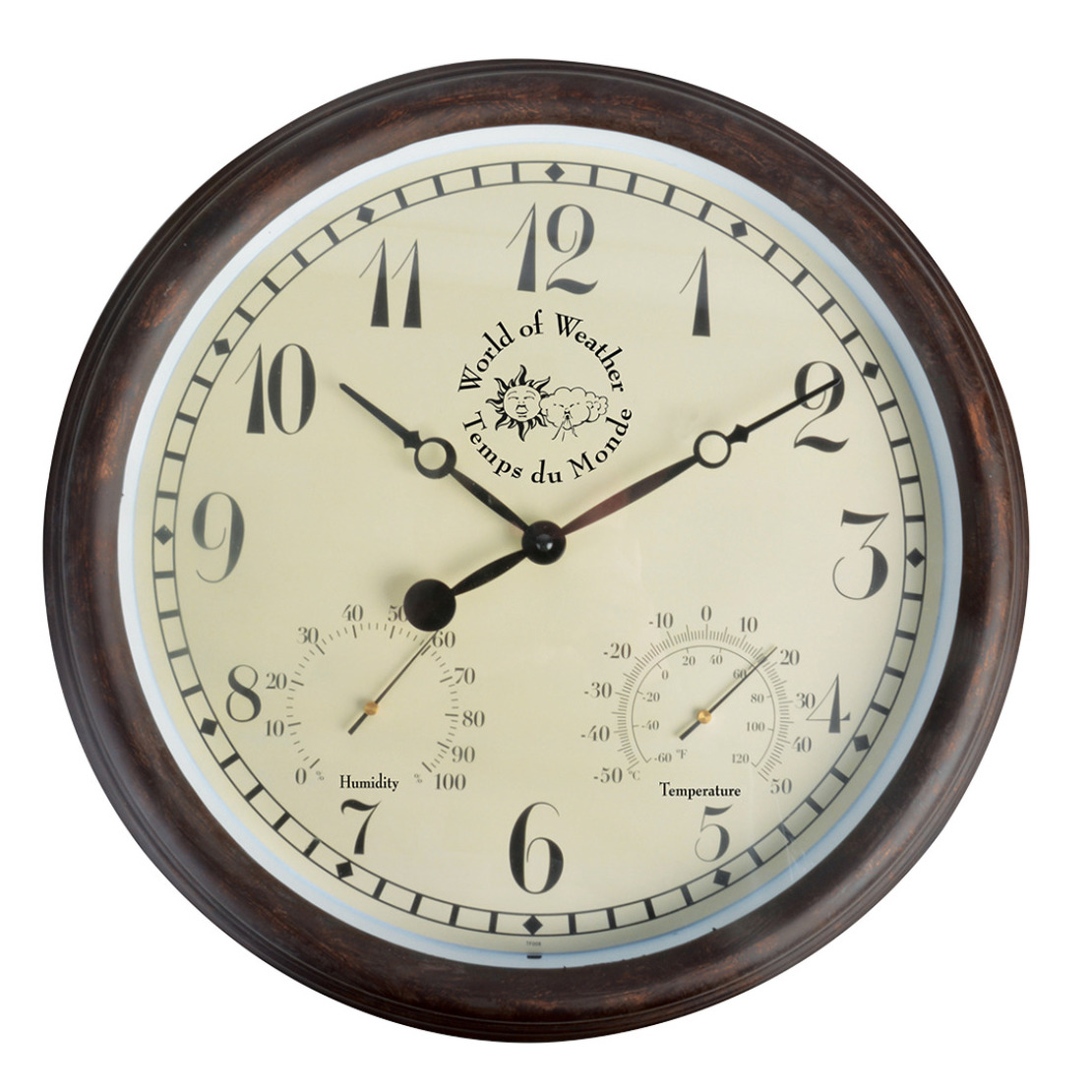 Gemaakt van weerbestendig kunststof, heeft deze klok een diameter van 38 cm en een dikte van 6.1 cm. Hierdoor is hij bestand tegen verschillende weersomstandigheden en kan hij gemakkelijk buiten worden geplaatst.
