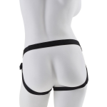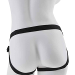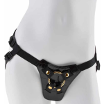 Het harnas is gemaakt van stijlvol kunstleer aan de voorkant en heeft verstelbare bandjes rondom de heupen en bovenbenen voor een perfecte pasvorm. De gevoerde binnenkant zorgt voor het ultieme comfort tijdens het dragen. Aan de voorkant van het harnas bevindt zich een goudkleurige O-ring die eenvoudig verwijderd kan worden dankzij de handige drukknopen. Dit maakt het mogelijk om de ring moeiteloos aan een dildo met zuignap te bevestigen.