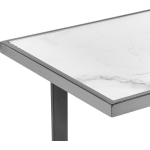Geef je interieur een vleugje allure met deze glamoureuze kaptafel met een glazen blad met marmereffect. Het stijlvolle ontwerp is voorzien van zilverkleurige metalen poten, die niet alleen een moderne uitstraling geven, maar ook zorgen voor stabiliteit. Het geharde glas en marmeren afwerking voegen een vleugje elegantie toe aan dit meubelstuk.