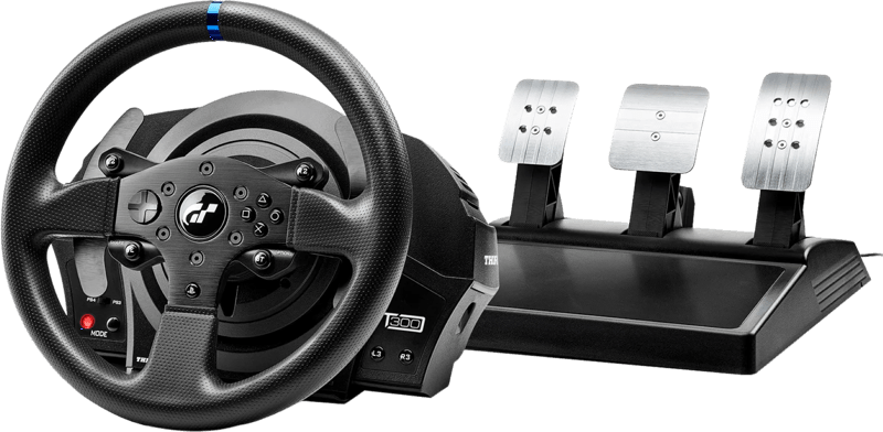 De Thrustmaster T300 RS GT Edition is een racestuur met officiële licentie van Gran Turismo en Playstation 4 / Playstation 3. Deze semiprofessionele racesimulator is een 1080° Force Feedback-racestuur dat een industriële borstelloze motor gebruikt met zeer snelle en goed reagerende realistische Force-effecten. Met een afneembaar racestuur met een diameter van 28 cm en centrale spaken van geborsteld metaal, het hele stuur is bekleed met versterkt rubber. Daarnaast komt het racestuur met drie verstelbare metalen pedalen, het gas- en het koppelingspedaal zijn instelbaar (hoogte en tussenruimte). Alles is compatibel op de pc, PS3 en PS4 met afneembare Thrustmaster-sturen en de T3PA-PRO, een pedaalset met 3 pedalen.