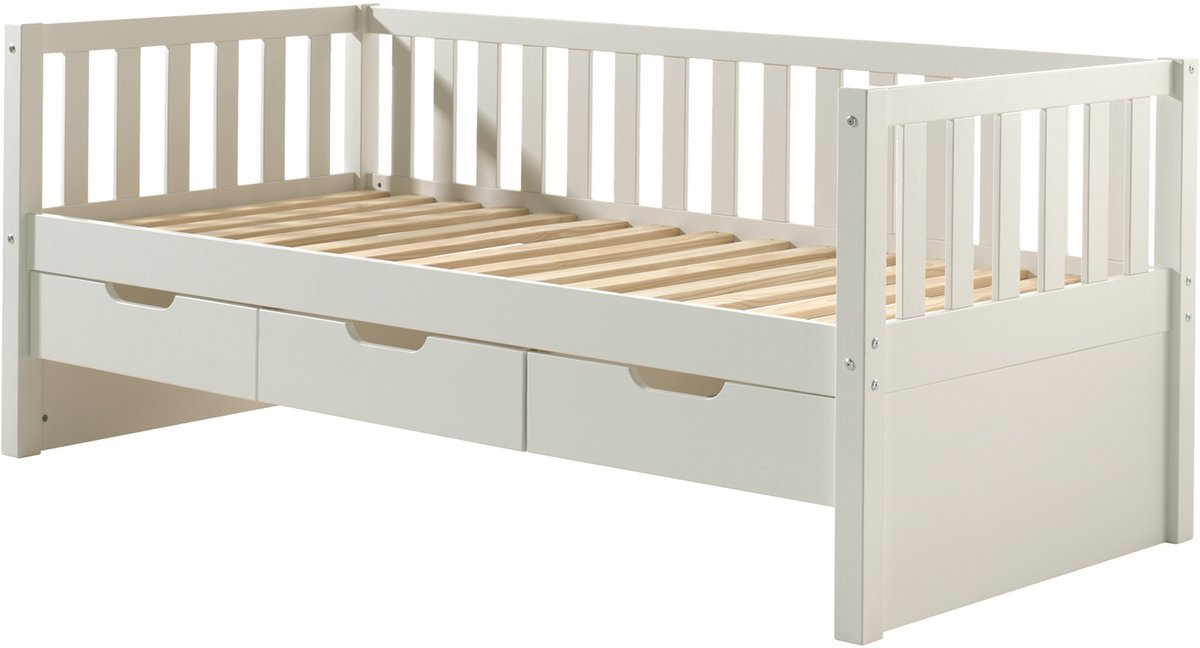 Kajuitbed Friedrich uit witgelakt dennenhout met 3 lades. Lattenbodem inbegrepen.