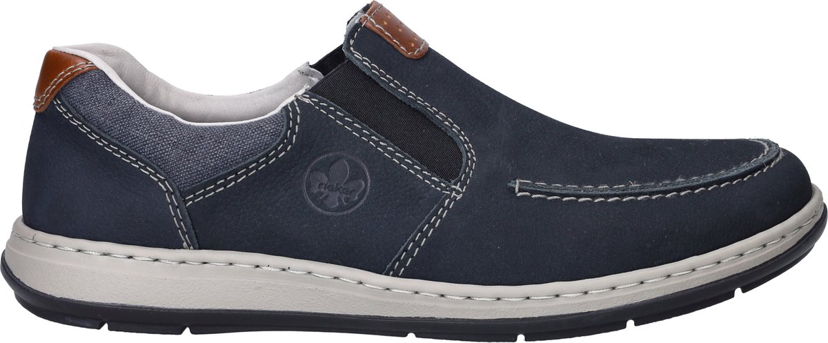 Blauwe Rieker heren instappers gemaakt van leer, net zoals de comfortabele binnenzool en de voering. Ter decoratie zijn de schoenen voorzien van jeans, cognacleren en elastieken inzetten. Door de elastieken inzetten kunnen de schoenen gemakkelijk aangetrokken kunnen worden. Over de schoenen lopen witte stiksels en op de voorkant is het leer omhoog gestikt, waardoor er een opstaande rand is ontstaan. De rubberen zool heeft een ... lees meer over dit product