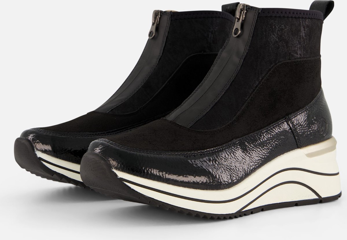Halfhoge Remonte sneakers voor dames in het zwart. De sneaker heeft een mooie zwarte lak rand en een trendy witte hoge zool.
