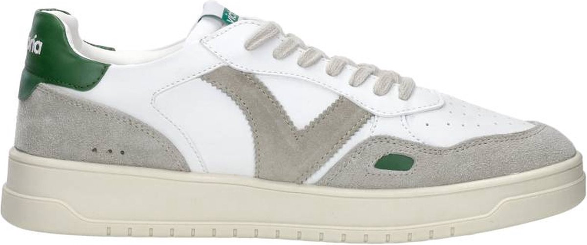 Specificaties: Pasvorm: normale pasvorm/ vetersluiting Bovenwerk: leer en synthetisch leer Temperatuurregeling: perforatiegaten in de neus zorgen voor ademend vermogen Voering: textiel en katoen Demping: zachte en dempende binnenzool Buitenzool: rubberen buitenzool Kleur: wit - lichtgrijs - groen Materiaal: leer - synthetisch materiaal - textiel - rubber lees meer over dit product