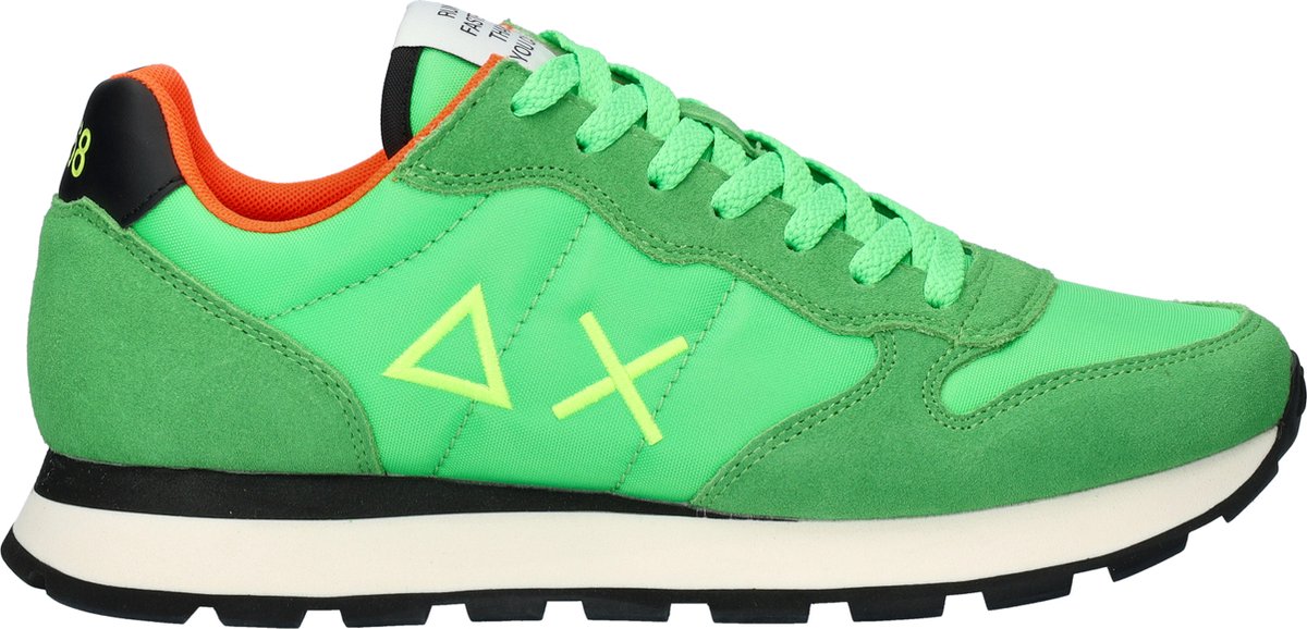 SUN68 is een Italiaans modemerk met casual designs van de beste materialen om iedere dag te dragen. Er is veel aandacht voor originele details en onderzoek in goede materialen. Dit groene model TOM SOLID NYLON MEN met accenten is uitgevoerd in stevig textiel en heeft een afwerking van suède panelen. Op de tong bevindt zich een textiel label met de quote RUN FASTER THAN YOU CAN en de hiel heeft een zwarte leren hielkap met gele opdruk. De geborduurde merkopdruk op de zijkant en de zwarte accentstreep in de zoolrand maken 'm extra opvallend. Deze lichtgewicht sneaker is gevoerd met geel ademend mesh in combinatie met zacht textiel en heeft een uitneembaar voetbed met comfortabele demping. Door de gewatteerde enkelkraag en tong ervaar je veel steun en comfort en de witte oplopende zool met zwarte loopzool heeft dankzij de vierkante noppen een optimale grip. Wissel je look af met de gele en groene veters voor een perfecte match bij je outfit!