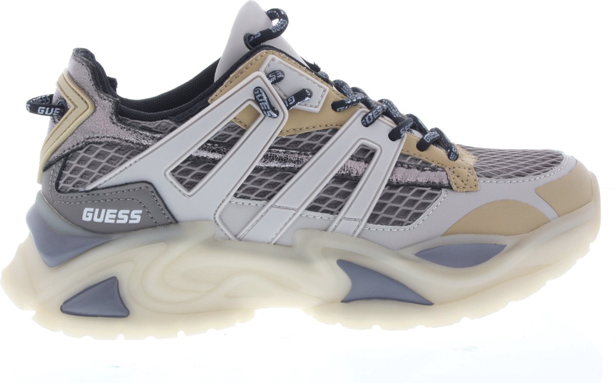 Chunky sneaker alert! Deze Guess sneaker voor dames voldoet aan alle voorwaarden van de nieuwe trend. Dit running model Belluna is gemaakt in het grijs leatherlook. De pasvorm valt normaal.