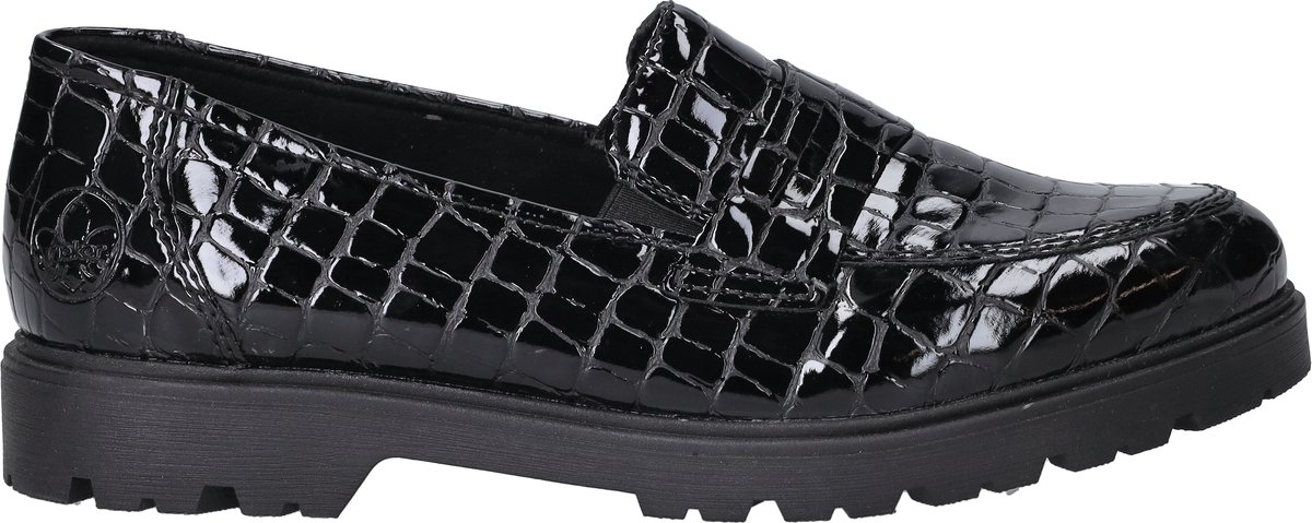 Voordelen Rieker dames loafers Op zoek naar een elegante instapper die direct opvalt? Deze zwarte loafers van Rieker combineren klasse met comfort. De glanzende krokolook in lak-kunstleer maakt elke outfit stijlvol, of je ze nu draagt naar kantoor of een etentje. Perfect voor dames met een smallere voetbreedte F die niet willen inleveren op modegevoel. Gemakkelijk instappen: dankzij de elastische inzet op de wreef glijd je er... lees meer over dit product