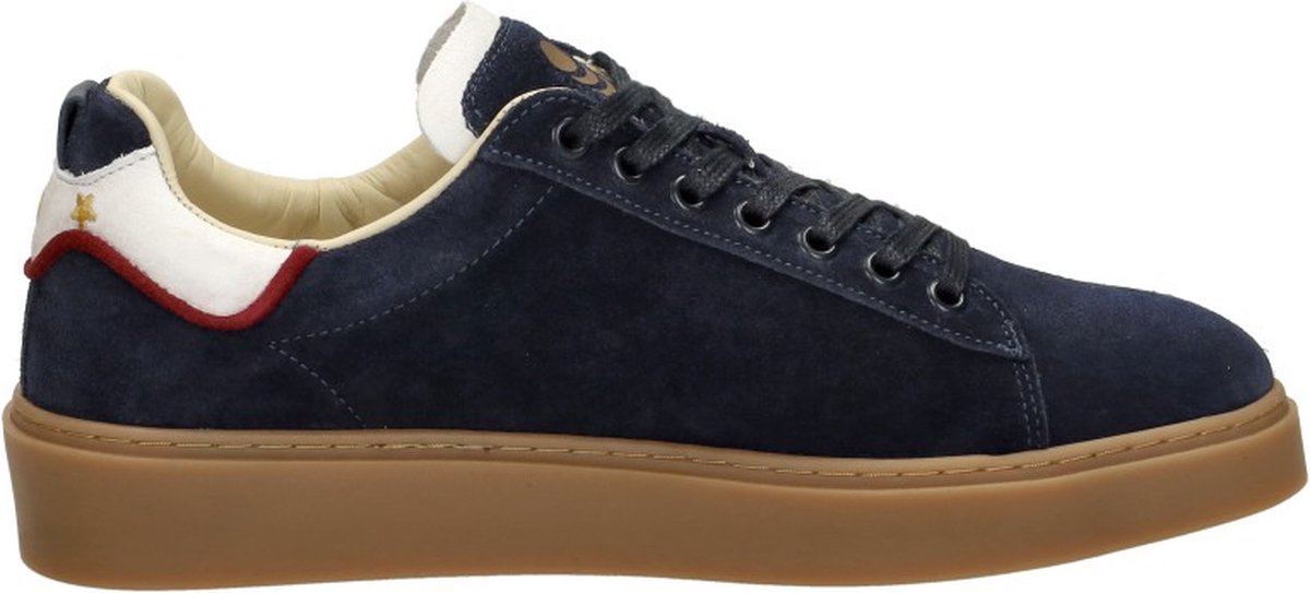 Stap stijlvol de dag in met de ELBA LOW sneakers van PANTOFOLA D'ORO. Deze lage, blauwe suède sneakers met ronde neus zijn perfect voor heren die comfort en klasse willen combineren. De hielstuk is van leer met opvallende rode bies en goudkleurige geborduurde steren. De tong heeft een witte leren rand met goudkleurige merkreliëf. Dankzij het uitneembare voetbed en de leren en textiele binnenkant, geniet je van ultiem draagcomfort. De bruine rubberen zool zorgt voor een stevige grip, ideaal voor een wandeling door de stad of een casual dag op kantoor. Combineer deze sneakers moeiteloos met een nette jeans of een chino voor een verfijnde, maar relaxte look. Veters strikken en gaan!