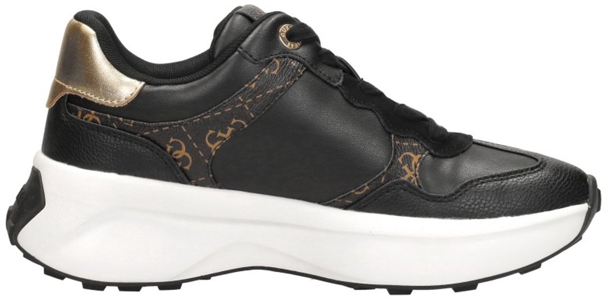 Ontdek de veelzijdigheid van de zwarte LUCKEI lage sneakers van GUESS. De schoen bestaat uit zwart leatherlook en leer met bruine accenten en logo's. De zijkant is afgewerkt met een goudkleurige hielcap. De binnenkant van textiel zorgt voor een aangename pasvorm, terwijl de rubberen zool grip biedt tijdens een dagje shoppen of een ontspannen wandeling in het park. Combineer deze sneakers moeiteloos met een casual jeans of een trendy jurk voor een eigentijdse look. De vetersluiting geeft een klassieke touch aan deze moderne must-have. Voeg een vleugje stijl toe aan je dagelijkse outfits met deze veelzijdige sneakers.