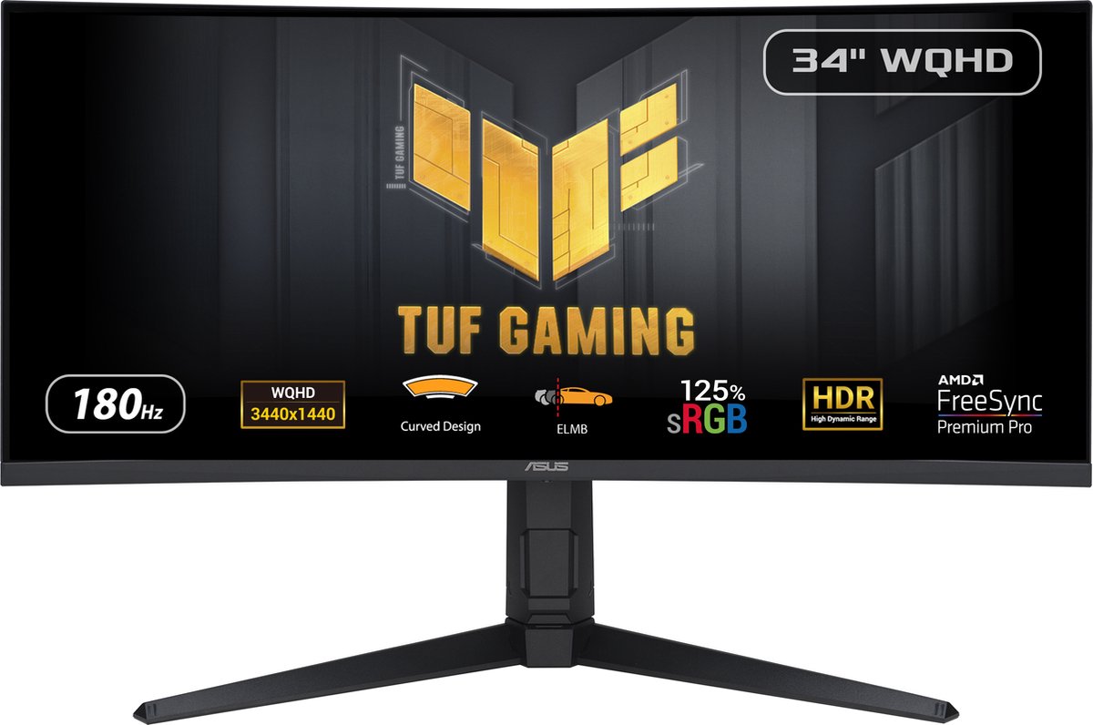 De ASUS TUF Gaming VG34VQL3A gaming monitor heeft een bliksemsnelle refresh rate van 180 Hz (overklokt) en ondersteunt Adaptive Sync-technologie (compatibel met AMD FreeSync) voor een soepele en stabiele game-ervaring. Deze curved gaming monitor heeft een diagonaal van 86 cm (34") en maakt indruk met een briljante WQHD-resolutie van 3440 x 1440 pixels. De lage responstijd van 1 ms (GtG) en ASUS Extreme Low Motion Blur Sync-tec... lees meer over dit product