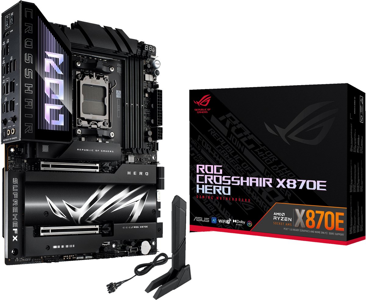 Het ASUS ROG CROSSHAIR X870E HERO moederbord is gebaseerd op de AMD X870E chipset en ondersteunt AMD processoren voor socket AM5. Dit moederbord heeft vier dual-channel DDR5 DIMM-sleuven voor maximaal 256 GB RAM. Andere kenmerken van de ASUS ROG CROSSHAIR X870E HERO zijn twee PCIe 5.0 x16 slots. Daarnaast beschikt de ASUS ROG CROSSHAIR X870E HERO over 8-kanaals geluid, een 5 Gigabit LAN-interface, een 2,5 Gigabit LAN-interface, Wi-Fi 7, Bluetooth, vier SATA3-poorten, vijf M.2-poorten, zes USB-A 3.2 (10 Gbit/s),twee USB-C 3.2 (10 Gbit/s) en twee USB 4 interfaces.