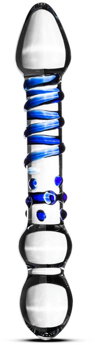 De EasyToys Glazen Dildo is een luxe dildo gemaakt van doorzichtig glas met diepblauwe details. De dildo heeft aan beide kanten een taps toelopende top en kan vaginaal en anaal gebruikt worden. Beide kanten kunnen gebruikt worden voor penetratie en zijn voorzien van een geribbelde en genopte structuur voor extra sensatie. Glazen sextoys zijn veilig te gebruiken in combinatie met alle glijmiddelen en condooms. Daarnaast kun je deze glazen dildo verwarmen of verkoelen door hem onder de warme of koude kraan te houden.