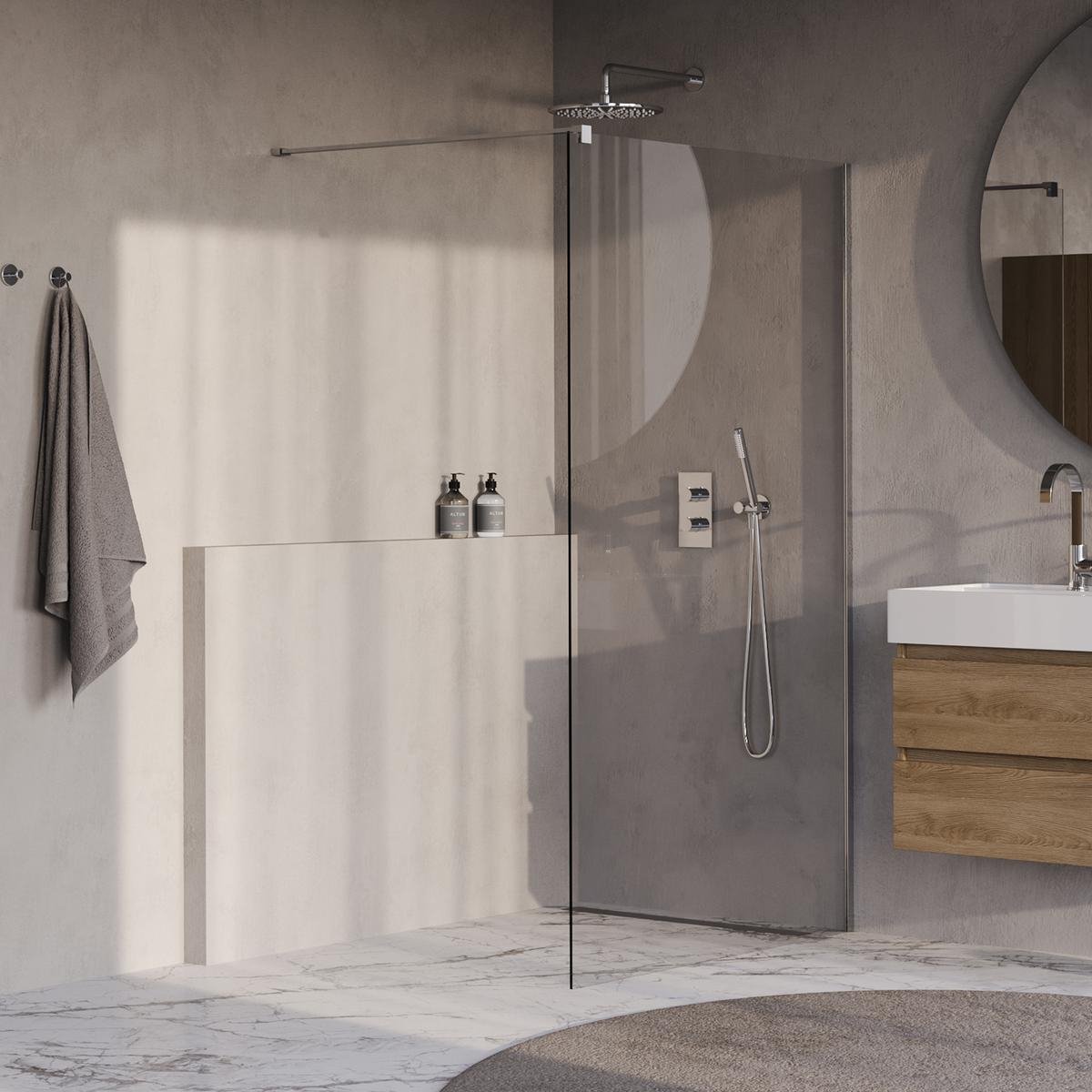 Afmetingen, Zijwand en AfwerkingZonder zijwand blijft een minimalistische, open opstelling behouden met maximale instapvrijheid. Een rechte glaswand zorgt voor spatbescherming in de meest gebruikte richting en houdt de badkamer visueel ruim, terwijl een strak lijnenspel behouden blijft. Een chroomafwerking geeft een heldere glans en past bij veel sanitairstijlen. Een solide glasopstelling ondersteunt een nette afwerking langs wand en vloer en helpt de douchezone overzichtelijk te houden. Een combinatie van design en gebruiksgemak die een badkamerproject direct naar een hoger niveau tilt.