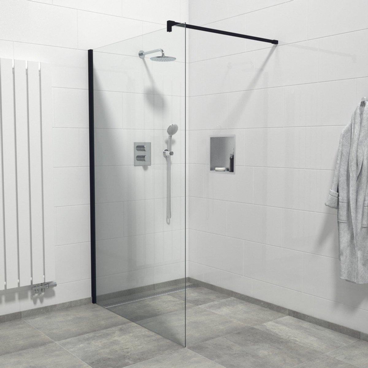 De combinatie van helder glas en een mat zwart profiel geeft deze inloopdouche een tijdloze en elegante uitstraling. Het minimalistische design past perfect in moderne badkamers en zorgt voor een rustige, luxe sfeer. Door het gebruik van hoogwaardige materialen blijft de uitstraling jarenlang mooi, zonder concessies te doen aan de stijl. Het matte zwart accentueert subtiel de lijnen van de douchewand, waardoor deze een echte eyecatcher wordt zonder te overheersen. Zo voeg je een verfijnd element toe dat jouw badkamer naar een hoger niveau tilt.