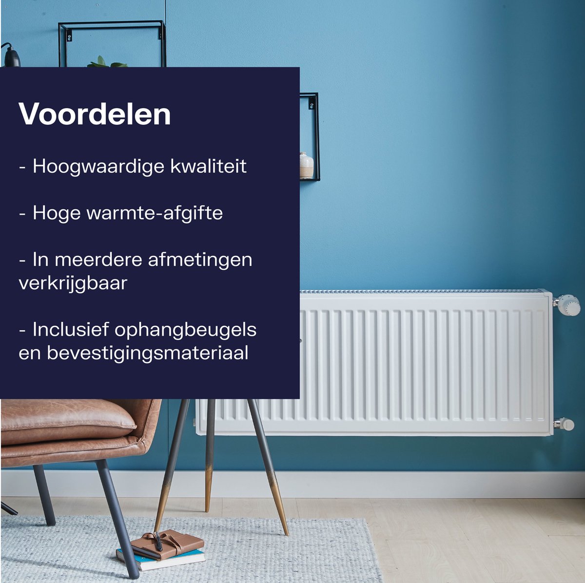 - Afstand tussen muur en radiator zelf in te stellen op 2,8 of 4,3 cm