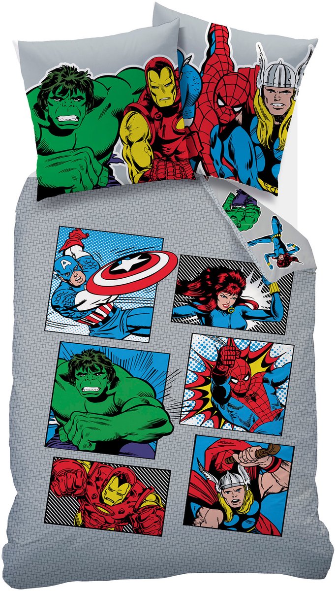 Dromen worden episch met dit stoere 1-persoons dekbedovertrek van Marvel's Avengers! Laat je kind elke nacht slapen onder de bescherming van hun favoriete helden: Spider-Man, Iron Man, Hulk, Thor, Captain America en Black Widow staan allemaal paraat voor een nieuw avontuur. Door de dubbelzijdige bedrukking kan er gevarieerd worden met het opmaken van het bed en is er altijd iets nieuws te ontdekken. Perfect voor elke kinderkamer met een heldenthema! Het dekbedovertrek is gemaakt van katoen en de bijpassende kussensloop van 63 x 63 cm maakt de set compleet. Een geweldig cadeau voor verjaardagen, feestdagen of als verrassing voor een echte superhelden fan!