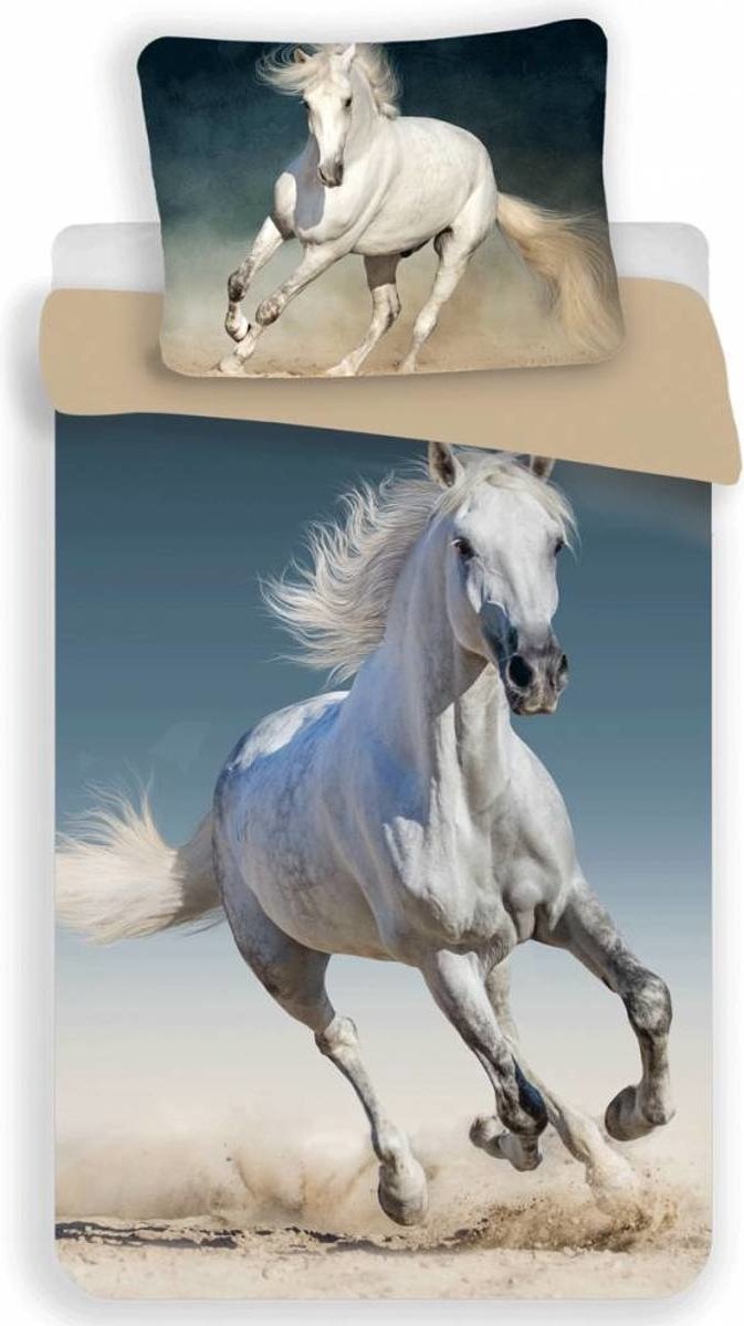 Animal Pictures Dekbedovertrek wit paard. Prachtig rennend wit paard op dit katoenen eenpersoons dekbedovertrek. Hier droomt iedere paardenfan van, galopperend op zo'n prachtig paard over het strand. Kruip onder dit dekbedovertrek en droom heerlijke paardendromen.