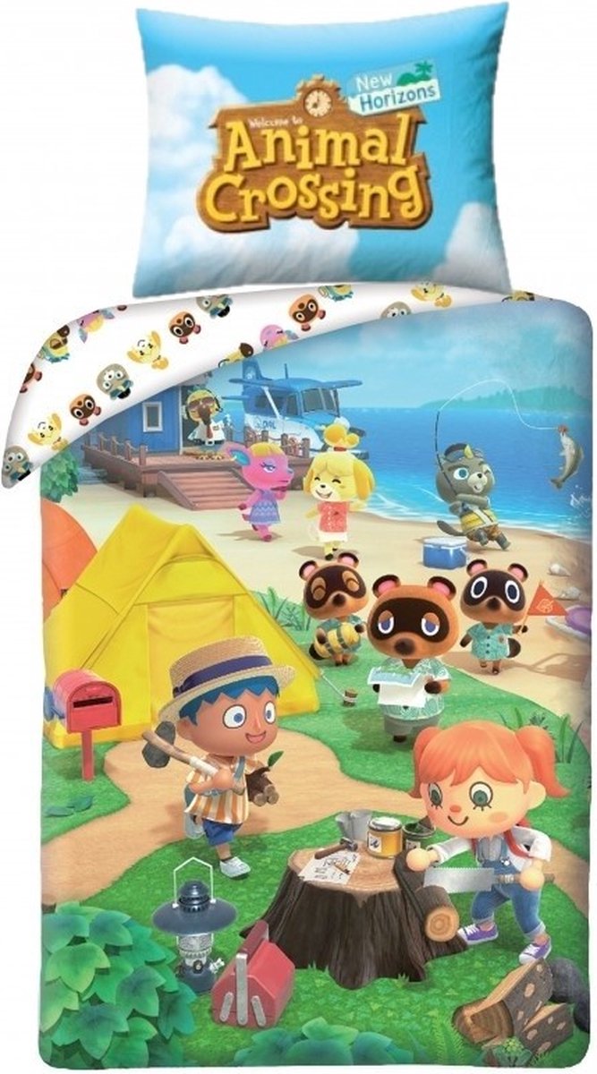 Animal Crossing Dekbedovertrek, Happy Home. Dit leuke eenpersoons dekbedovertrek van de populaire Nintendo game Animal Crossing is een echte must-have voor de liefhebbers van dit leuke spel. In deze fantasiewereld kan jij helemaal je gang gaan met het bouwen van huizen en ondertussen leven met de grappige diertjes in dit dorp. Uiteraard is er ook tijd voor ontspanning, zoals je ziet op dit dekbedovertrek. Kamperen of vissen, alles is mogelijk! Het overtrek is dubbelzijdig bedrukt en wordt geleverd met een extra groot kussensloop. Kortom: een geweldig cadeau voor de echte Animal Crossing fan!