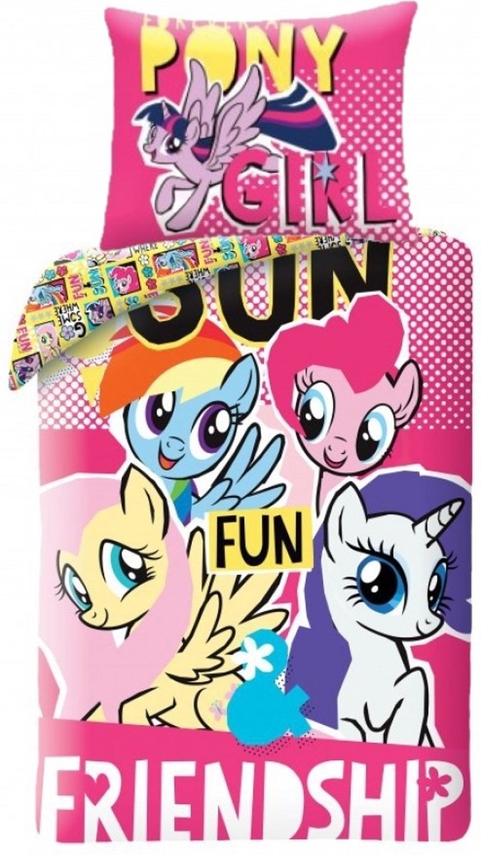 My Little Pony Dekbedovertrek, Friendship. Prachtig eenpersoons katoenen dekbedovertrek van de karakters van My Little Pony. Je ziet Rarity, Pinkie Pie, Rainbow Dash en Sweetie Drops. Wordt geleverd met extra groot kussensloop en in een bijpassend tasje, welke je voor, bijvoorbeeld, een pyjama kan gebruiken. Voor elke liefhebber van My Little Pony is dit een prachtig cadeau.