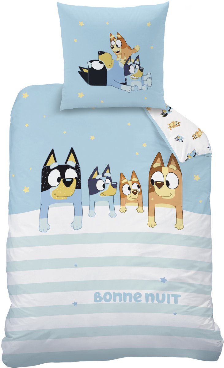 Bluey Dekbedovertrek, Together. Het is een gezellige boel bij Bluey! Samen met haar vader, moeder en zusje zijn zij klaar voor de nacht. Dit geweldige katoenen dekbedovertrek is een echte blikvanger voor elke kinderkamer. De overtrek heeft een dubbelzijdige bedrukking, waardoor er afgewisseld kan worden met het opmaken van het bed. Ook leuk om cadeau te geven voor een verjaardag of andere feestelijke gelegenheid aan een echte Bluey-fan!