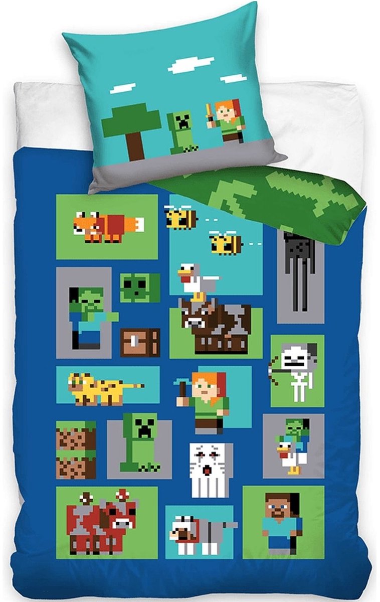 Minecraft Dekbedovertrek Blocks 140 x 200 cm - Katoen (60 x 70 cm) Minecraft Dekbedovertrek Blocks 140 x 200 cm - Katoen (60 x 70 cm). Dit stoere katoenen dekbedovertrek van Minecraft is een echte musthave voor de fans van dit gave spel. Droom jij ook over mobs, creepers en hoe je zo lang mogelijk Minecraft kan overleven? Dan wordt het slapen onder dit tweezijdig bedrukte overtrek en extra grote kussen een feestje! Een fantast... lees meer over dit product