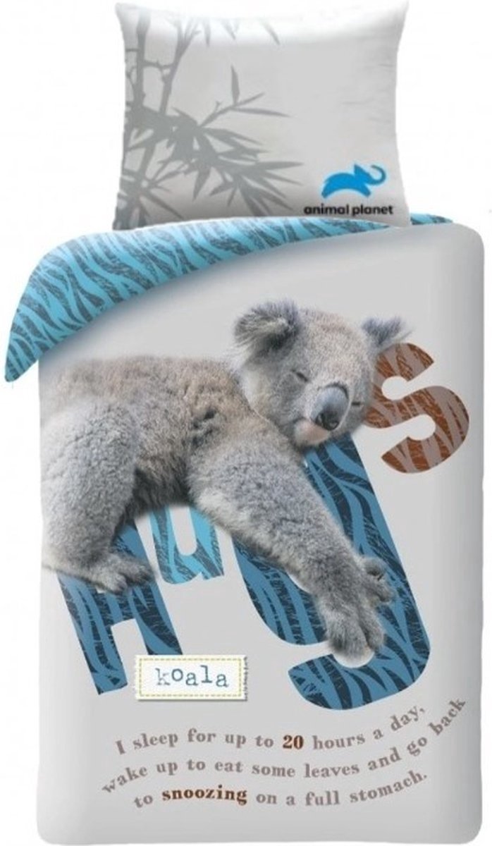 Animal Planet Dekbedovertrek Koala Hugs 140 x 200 cm Animal Planet Dekbedovertrek, Koala. Een mooi katoenen dekbedovertrek van Animal Planet met een extra grote kussensloop. De overtrek heeft een schattige afbeelding van een Koala en wat interessante weetjes over dit leuke beestje. De achterkant van het overtrek heeft een contrasterende print, wat een leuk effect geeft bij het openslaan. Een geweldig cadeau voor elke dierenlie... lees meer over dit product