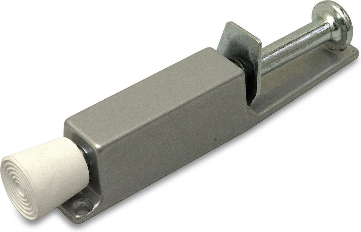 Deurvastzetter / deurvergrendeling met voetstift 120 mm. Deze deurvastzetter heeft schroefbevestigingen voor verticale montage aan de deur. Neerslaand model een voetstift en rubberen dop. Materiaal: zamac. Kleur: zilvergrijs.