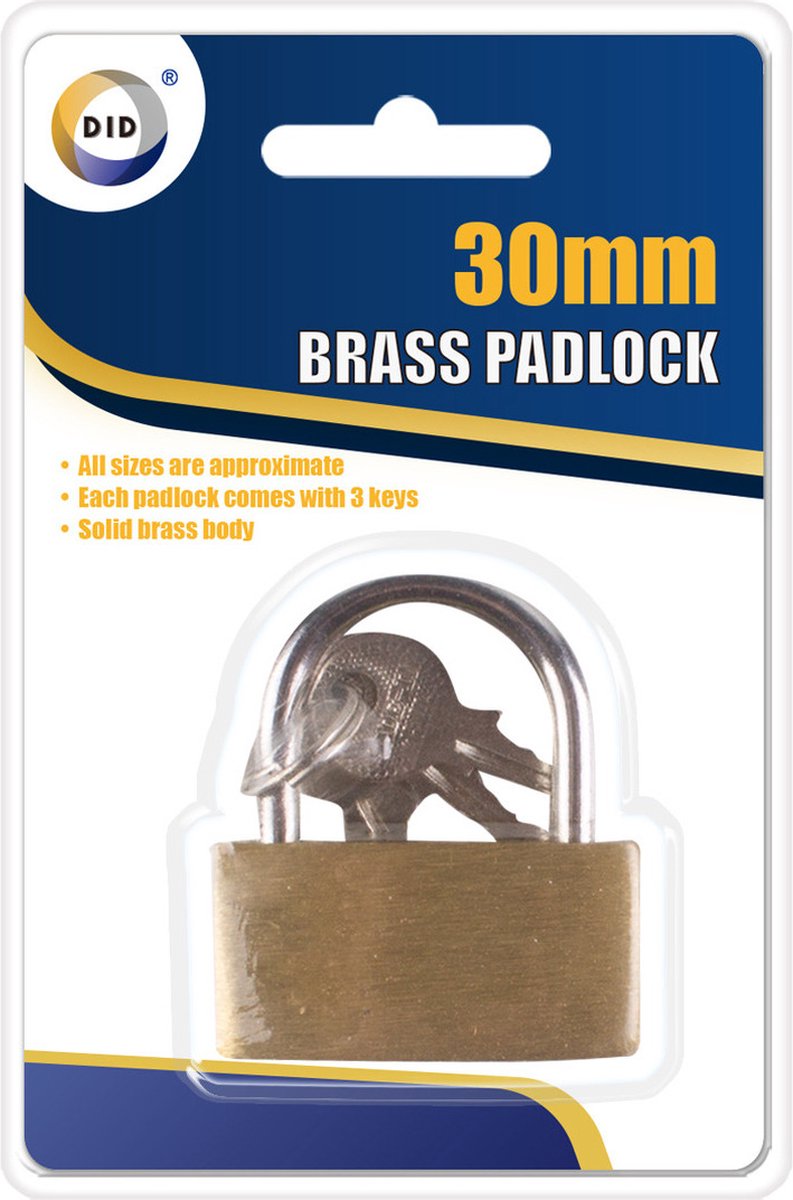 DID hangslot wordt geleverd met 3 sleutels. Te gebruiken bij bijvoorbeeld het vergrendelen van een kluisje of koffer. Materiaal: Massief messing. Formaat: ca. 3x3 cm. Kenmerken Merk: DID Materiaal: Messing Kleur: Brons Lengte: 3 cm Breedte: 3 cm DID DID, een merk van Dina International Ltd., is een betrouwbaar familiebedrijf in het hart van de Midlands, VK. Als een van de grootste importeurs en distributeurs van diverse goed... lees meer over dit product