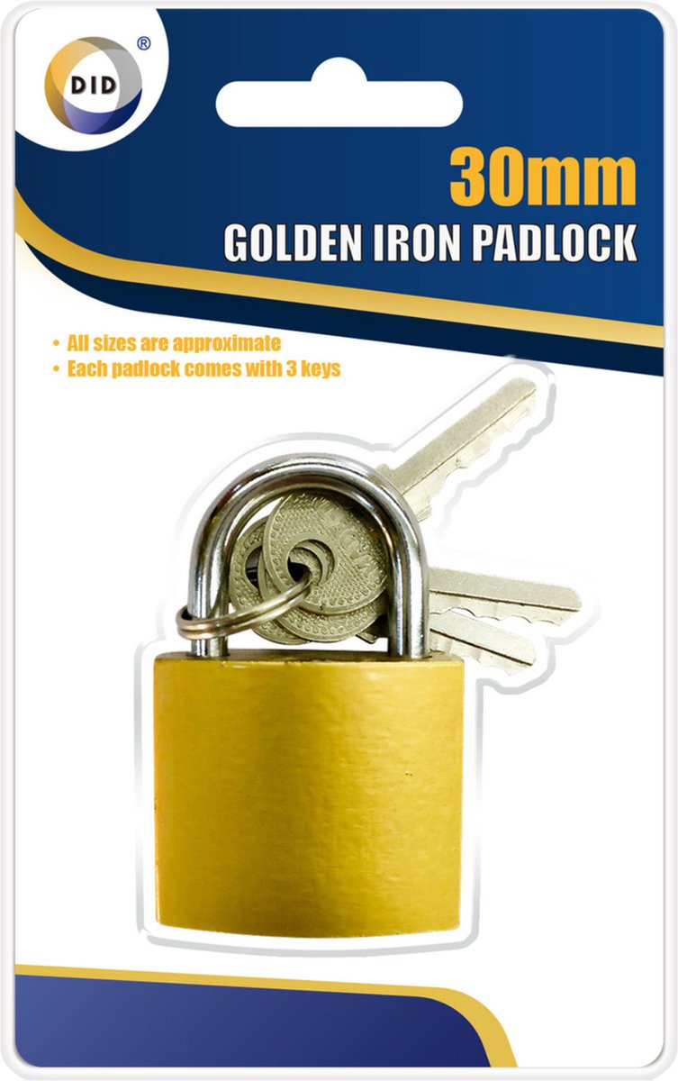 DID hangslot, 30 mm. Dit hangslotje wordt geleverd met 3 sleutels. Handig slot voor o.a. een koffer, gereedschapskist, kluis of voor in combinatie met een schakelketting. Materiaal: ijzer. Afmeting: ca. 3x3 cm.