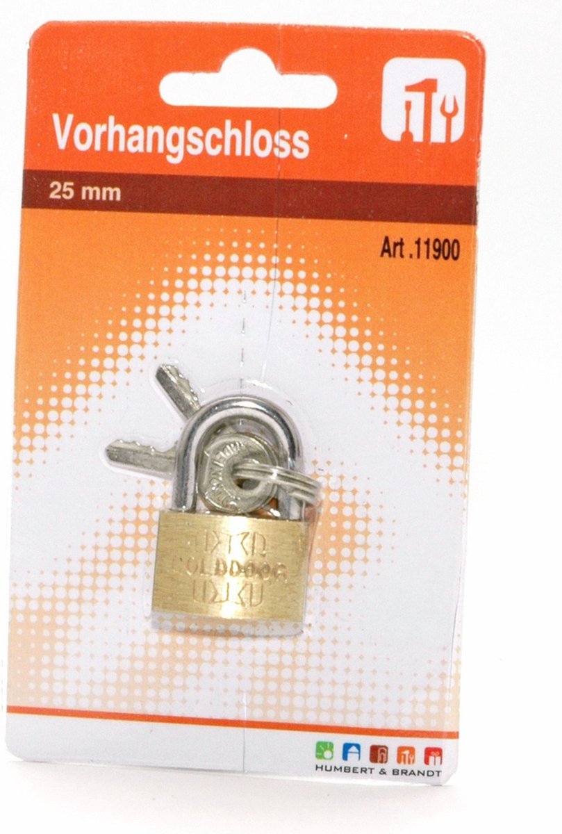 Hangslot van 25 mm gemaakt van sterk messing met een beugel van gehard staal en een stiftcilindermechanisme met 3 sleutels, ook te gebruiken als kofferslot. Handig hangslot voor bijvoorbeeld een koffer, gereedschapskist of kluis. Hangsloten van hoogwaardige kwaliteit voor vergrendelingssystemen. Kenmerken Merk: Humbert Materiaal: Messing Kleur: Brons lees meer over dit product