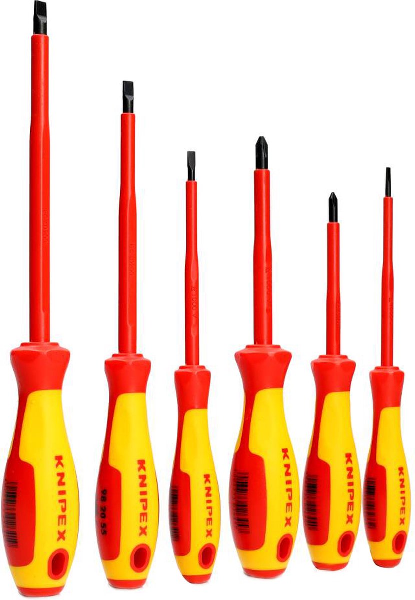 De schroevendraaierset 00 20 12 V01 van Knipex bevat zes VDE-geteste schroevendraaiers met verschillende profielen en afmetingen. De geïsoleerde klingen zijn gemaakt van chroom vanadium molybdeen staal en zijn gepolijst, de handgrepen zijn bijzonder anti-slip en comfortabel dankzij geïsoleerde meer-component hulzen. Knipex gereedschappen met het speciale symbool 1000 V zijn goedgekeurd voor werkzaamheden tot 1000 volt wisselstroom. Om er zeker van te zijn dat de speciale isolatie daadwerkelijk bestand is tegen de spanningen, wordt elk gereedschap onderworpen aan een doorslagtest met 10.000 V wisselstroom voordat het de Knipex fabriek verlaat.