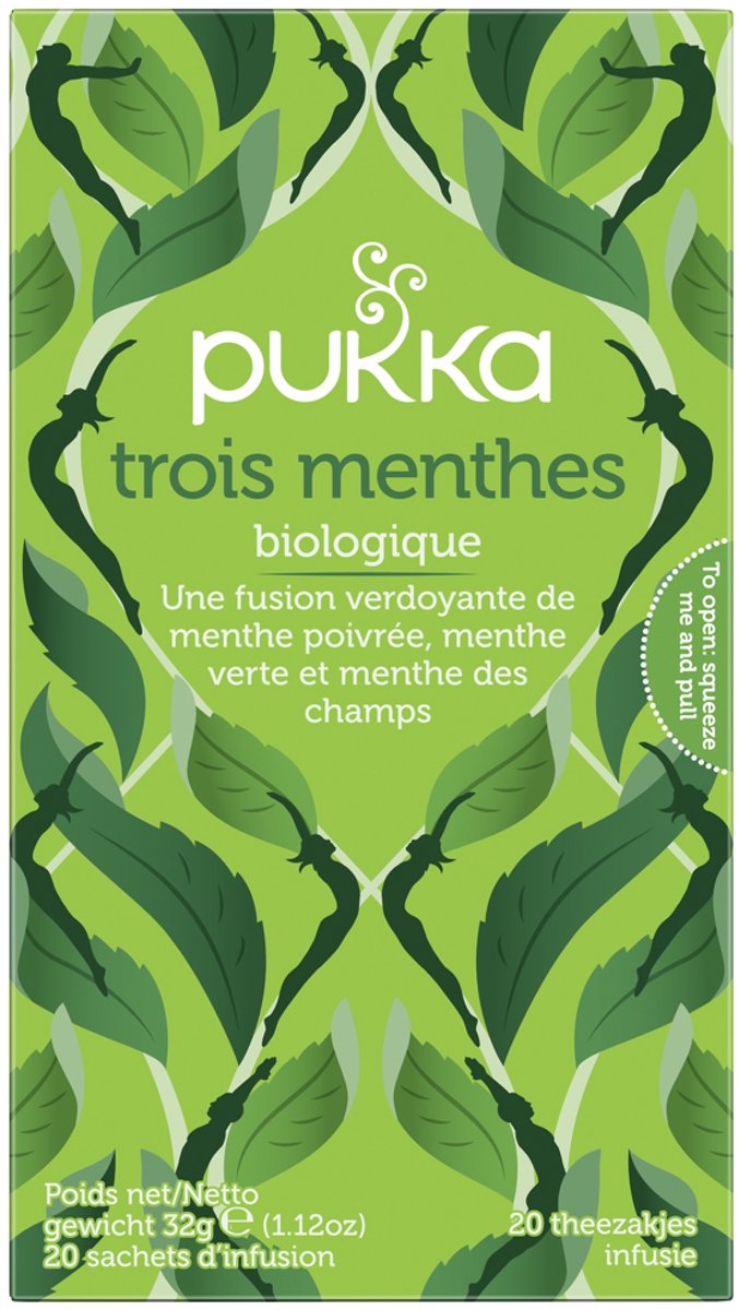 Pukka Thee Three Mint 20 stuksEen doosje bevat 20 individueel verpakte theezakjes die volledig biologisch afbreekbaar zijn. * Een blend met pepermunt, groene munt en veldmunt. * Van nature cafeïnevrij , duurzaam verbouwd en 100% biologisch geteelde ingrediënten. * Pukka is aangesloten bij 1% for the Planet. Dit product is Fair for Life gecertificeerd. * Breng de heerlijke kruiden tot leven door ze tot 15 minuten in vers gekookt water te laten trekken.Intens geurend en opwekkend. Zuiver en eerlijk. De Pukka theeën zijn gebaseerd op de helende kracht van de aloude Ayurvedische leer van evenwicht en harmonie. Alle ingrediënten zijn biologisch en ethisch verantwoord geproduceerd. Voor ieder moment en elke stemming of behoefte is er een theevariant. Een pure prikkeling van de smaakpapillen. Dát is munt. Deze Pukka Three Mint thee combineert pepermunt, groene munt en akkermunt. Een heerlijk levendige en opwekkende thee met een knisperend frisse en volle smaak.Pukka streeft ernaar positieve verandering te brengen op de wereld - voor jou, de natuur en alles daar tussenin. Pukka Three Mint is een blend met pepermunt, groene munt en veldmunt. Gemaakt van 100% biologische ingrediënten die duurzaam verbouwd zijn. Breng deze heerlijke kruiden tot leven door ze tot 15 minuten in vers gekookt water te laten trekken.