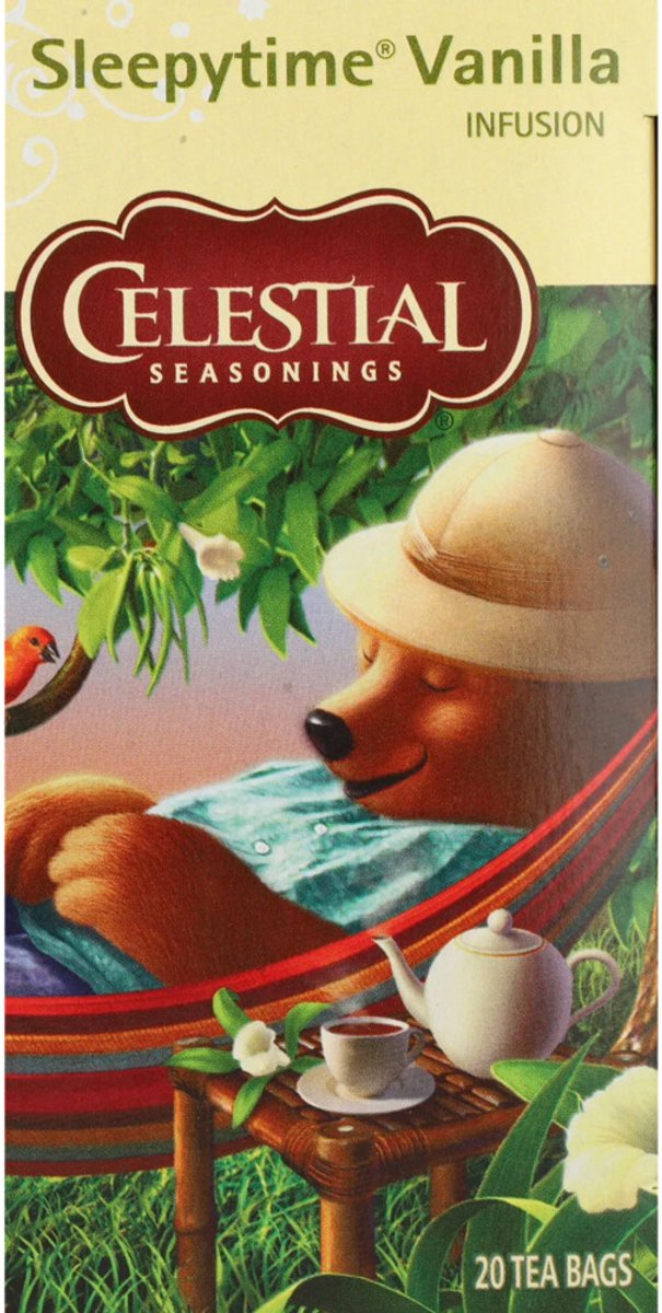 Celestial Sleepy Time VanilleCelestial Seasonings Sleepy Time Vanille is een rustgevende kruidenthee die je helpt ontspannen na een drukke dag. De subtiele smaak van vanille voegt een zachte zoetheid toe, waardoor deze thee perfect is voor het moment van rust. Geniet van de kalmerende werking van deze melange, ideaal voor een goede nachtrust. Dankzij de zorgvuldig geselecteerde kruiden is het de perfecte keuze om tot rust te komen en je dag af te sluiten. * Rustgevend en ontspannend * Subtiele vanillesmaak * Ideaal voor de avond