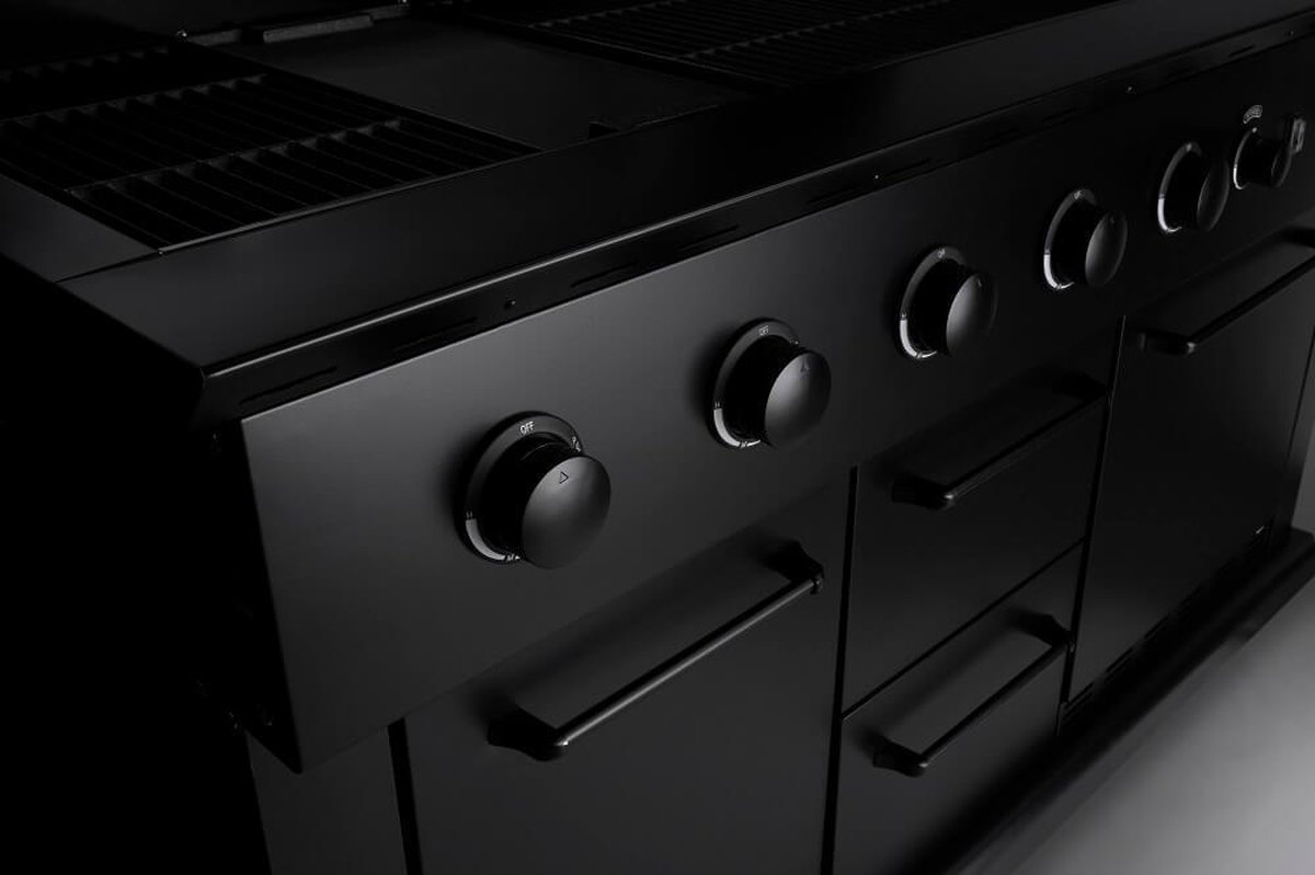 Of je nu valt voor de elegante RVS uitvoering of de stoere zwarte variant, met zijn grote knoppen en strakke lijnen is deze buitenkeuken een eigentijdse verschijning.