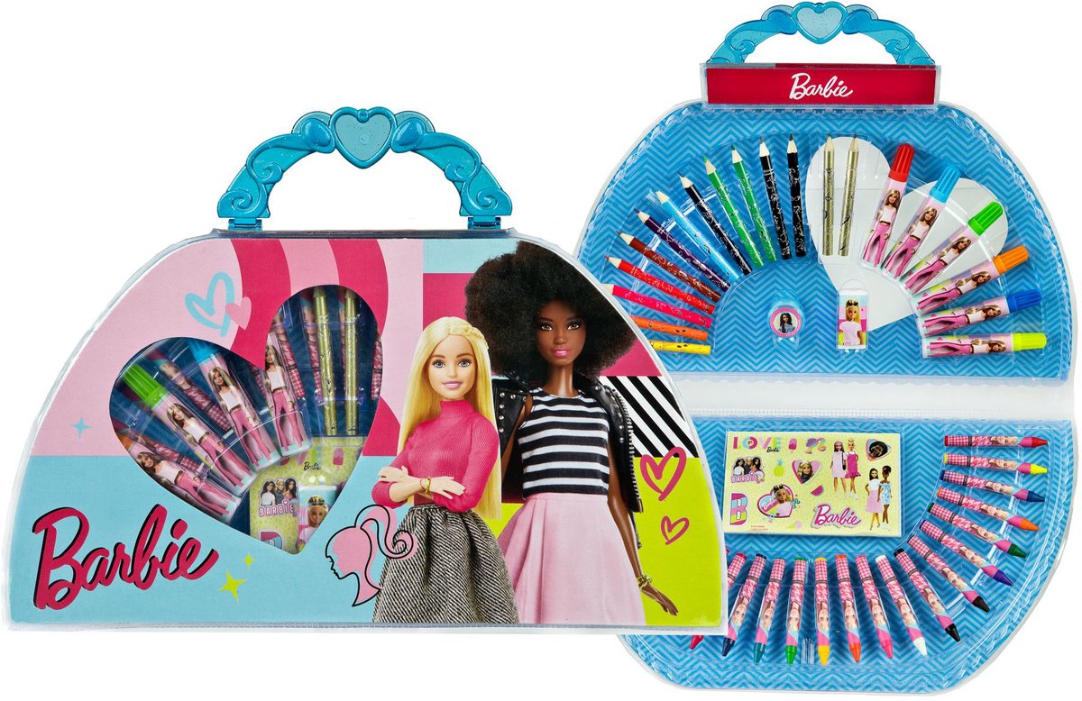 Barbie Kleurkoffer 51-delig Deze Barbie kleurkoffer zit boordevol kleurplezier! Deze kleurset is een geweldig cadeau voor kinderen, vooral voor de Frozen fans. De draagbare koffer zorgt ervoor dat alle spullen netjes bij elkaar blijven, makkelijk te pakken zijn en ng makkelijker zijn mee te nemen. 12 mini kleurpotloden 6 stiften 24 kleurpotloden gum, 2 mini potloden, puntenslijper, 4 posters en 1 stickervel Afmeting van de k... lees meer over dit product