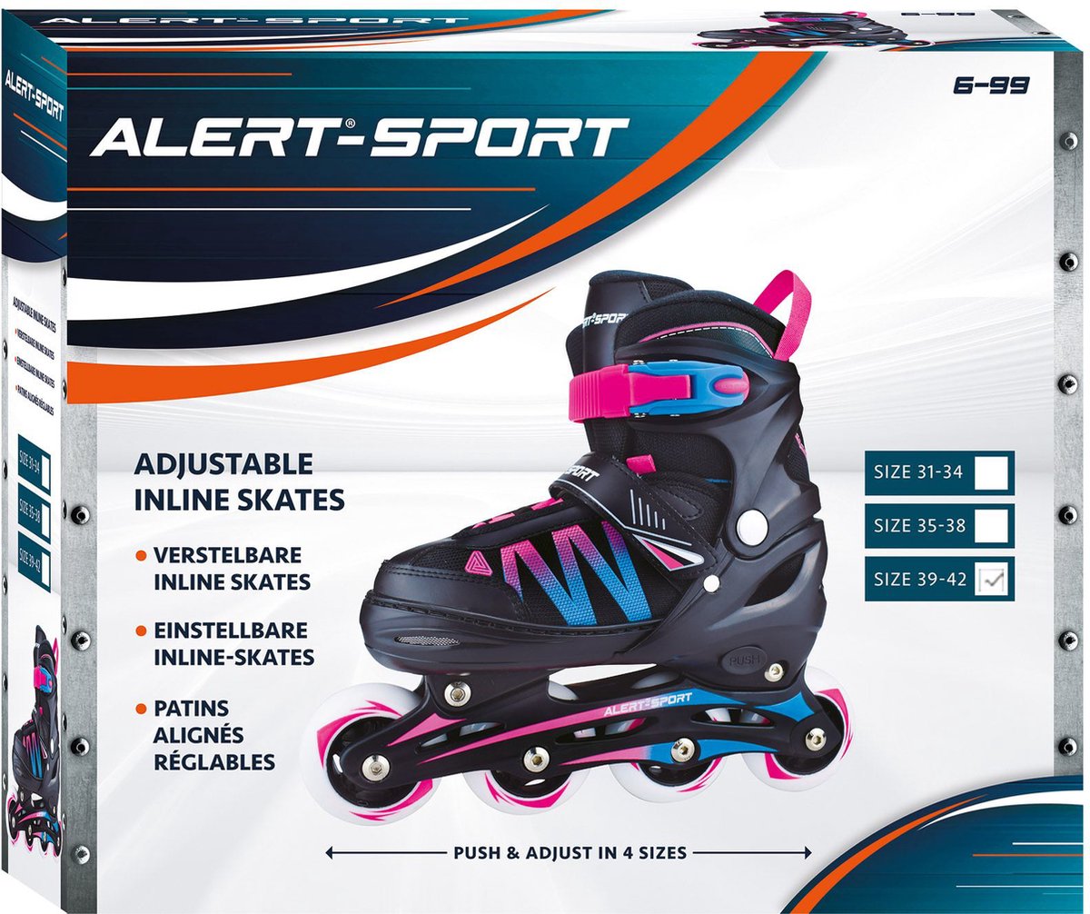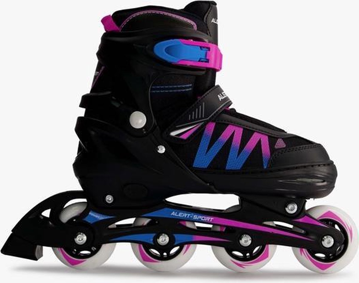 Alert Inline Skates Het is niet alleen superleuk om te skaten met deze skates, je ziet er ook nog eens supercool uit! De skates hebben een zwart met blauw-roze kleurenschema dat je er flitsend uit laat zien. Dankzij de soft wieltjes van 70 x 24 mm rijdt de skeeler heerlijk en hij is makkelijk te sluiten. Je kan de skeelers lang gebruiken, want hij is verstelbaar in maat 39 t/m 42. Zo zal jij superlang plezier hebben van deze g... lees meer over dit product