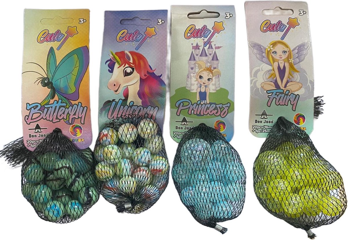 Knikker 84 stuks - Cute collection - 4 x 21 stuks Knikkeren is een tijdloze activiteit die jong en oud blijft vermaken. Met deze set van 84 knikkers heeft u alles wat u nodig heeft om te beginnen met spelen. De set bevat 84 knikkers in 4 verschillende kleuren en designs, zodat u kunt spelen met stijl en uw eigen unieke verzameling kunt opbouwen. De set bestaat uit : 21 x Butterfly - 21 x Unicorn - 21 x Princess - 21 x fairy D... lees meer over dit product