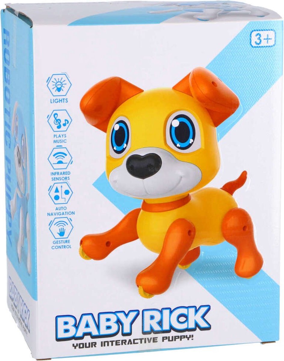 Baby Rick Interactieve Robot Hond Schattig oranje-gele robothondje met licht- en geluidseffecten. De hond is 20 cm groot en roze van kleur. Met infrared sensoren waardoor hij reageert op beweging, en tijdens het lopen obstakels vermijdt. Geschikt voor kinderen vanaf 3 jaar. lees meer over dit product