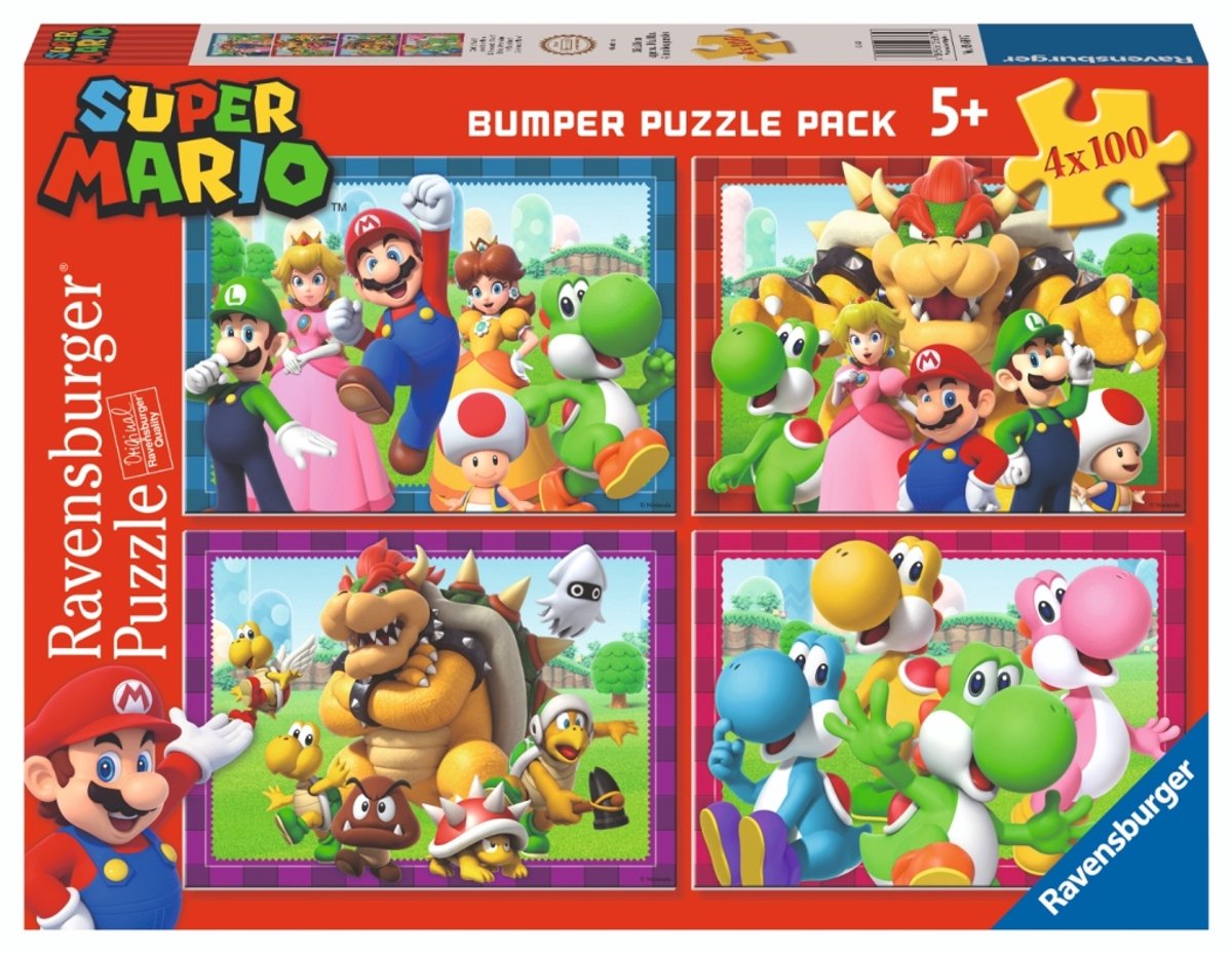 Ravensburger Super Mario puzzel 4-in-1 100 stukjes kartonMet de Super Mario puzzel van Ravensburger duik je in een wereld vol avontuur en kleur! Deze vrolijke 4-in-1 puzzelset bestaat uit vier verschillende puzzels van elk 100 stukjes, allemaal met een uniek Super Mario-thema. Ideaal voor jonge en oudere fans die graag samen puzzelen en genieten van de herkenbare figuren uit het populaire spel.De stevige kartonnen stukjes passen perfect in elkaar en zorgen voor urenlang puzzelplezier. Of je nu alleen speelt of samen met vrienden of familie, deze puzzelset brengt iedereen bij elkaar. Ontdek telkens weer een nieuw Super Mario-avontuur terwijl je de puzzels legt!Extra informatieBevat vier unieke Super Mario-puzzels van 100 stukjesGemaakt van stevig karton voor langdurig speelplezierGeschikt voor kinderen vanaf 3 jaar en volwassenenPerfect cadeau voor Super Mario-fans.