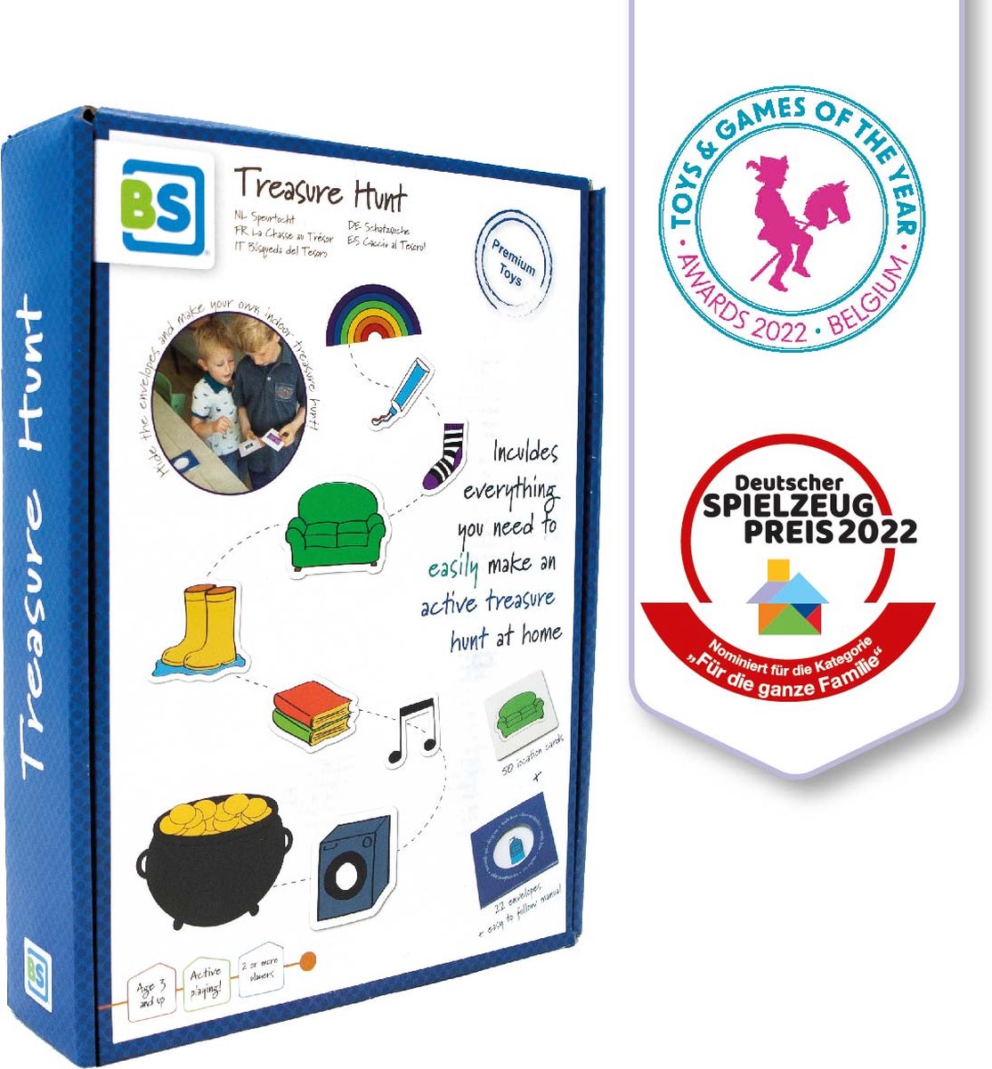 BS Toys Speurtocht kinderspelMaak je eigen speurtocht in huis! Ouders kunnen de speurtocht maken door de kaarten te verstoppen. Laat de kinderen vervolgens op zoek gaan om zo snel mogelijk de pot met goud te vinden. Volg de kaarten om de pot met goud te vinden! Maak met de 50 kaarten elke keer een nieuwe koers. Maak het zo lang als je wilt!Specificaties:Kleur: wit, blauw, geelKleur opdruk: multicolorGeslacht: juniorMateriaal: ... lees meer over dit product