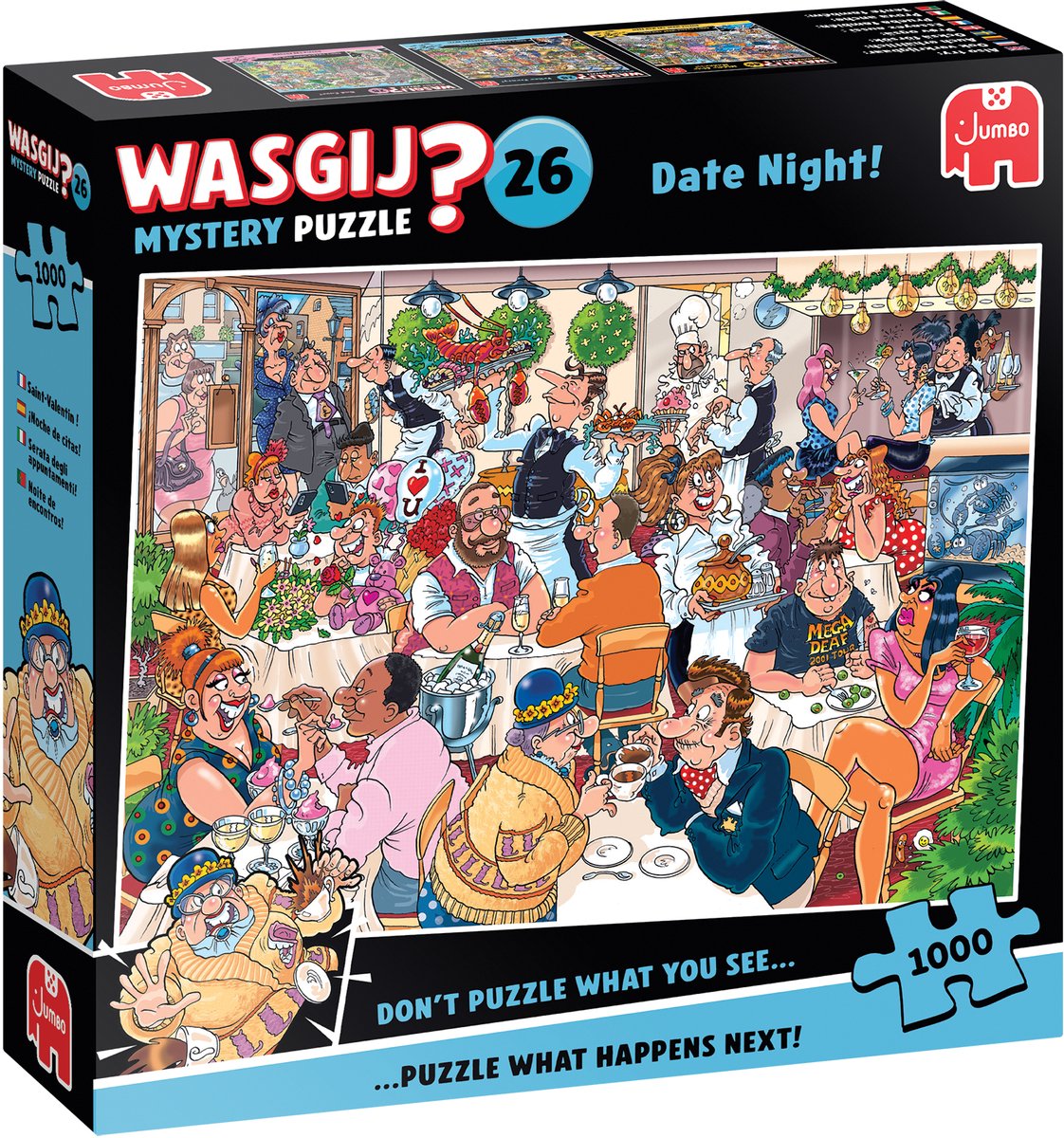 Wasgij Mystery 26 - Date Night! - Puzzel - 1000 stukjesHet is druk, druk in de bistro tijdens Valentijnsdag. Stellen vieren op hun eigen speciale manier de liefde en bij de deur staan er meer mensen die wachten. Bestellingen komen snel en in grote hoeveelheden binnen, terwijl de keuken probeert het hoofd boven water te houden. Maar pas op! Wat gebeurt er als de ober met het kreeften- en krabgerecht knoeit? Kan jij het mysterie... lees meer over dit product